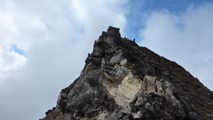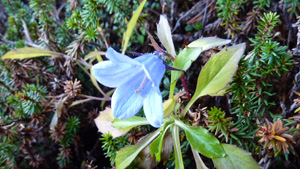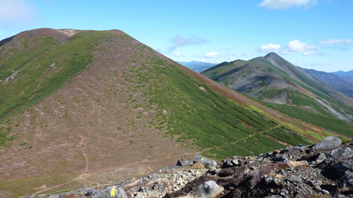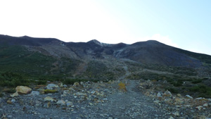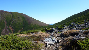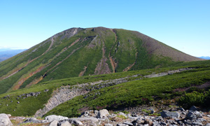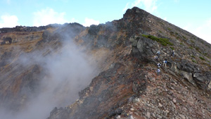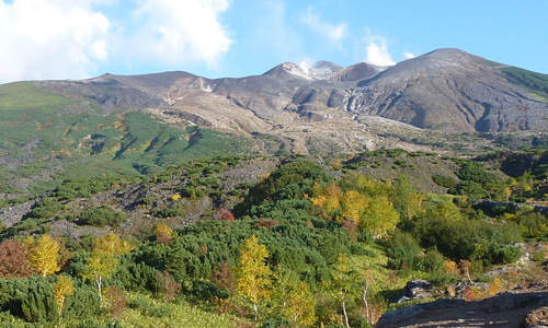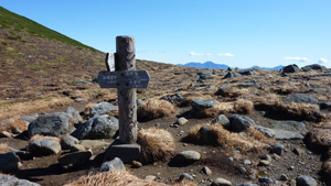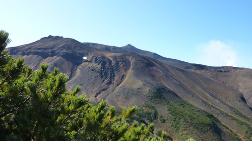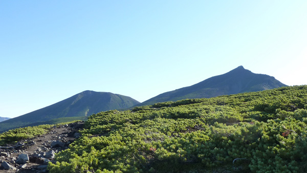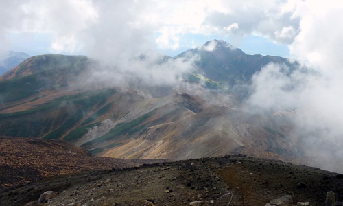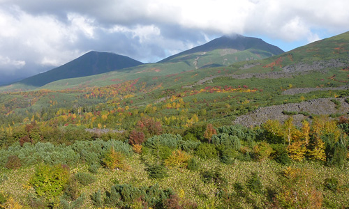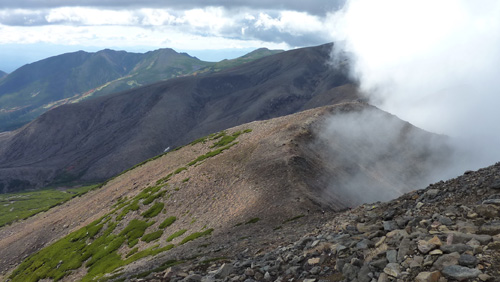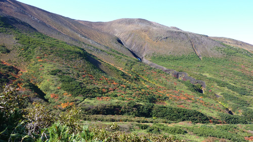 秋晴れが期待される。まだ歩いていない美瑛岳ー十勝岳の稜線に挑戦する。ここを歩くと、富良野岳からオプタテシケ山までの十勝連峰全山縦走が達成される。夜明け前の朝3:30札幌発、6時過ぎ十勝岳の登山口望岳台に着く。 望岳台から正面に十勝岳を望みながら登る。右手に富良野が朝日に照らされている。 ![]() ( 正面に十勝岳 右手に富良野岳) 以前はリフトの支柱の下が雲の平の分岐であったが、今は撤去されている。分岐の所に標識が立っている。雲の平は平坦な気持のよい道だ。ところどころにあるナナカマドの紅葉を見ながら歩く。シラタマノキの白いつぼみがまぶしい。イワギキョウが揺れていた。 ( 雲の平を行く・・・左に美瑛富士 右に美瑛岳 ) ![]() ( シラタマノキ ) ( イワギキョウ ) ポンピ沢を越えるといよいよ急斜面。振り返ると歩いてきた雲の平の道。 ![]() ( 振り返ると歩いてきた雲の平の道 ) そしてさらに上ると、鋸岳の横に十勝岳が見えてきた。今日はあの頂上まで行く。 ( 鋸岳の横に十勝岳の雄姿が見える ) 分岐に着く。数人のグループが休んでいた。ここから一般的には稜線を登る。お花畑の道だが急である。前に登った時は山頂で、「美瑛富士の方が楽だよ。」と言われたので、今回は直登せず美瑛富士側から登ることとする。美瑛富士の分岐を目指す。 ![]() ( 稜線・美瑛富士分岐 ) ( 美瑛富士・美瑛岳の分岐を目指す ) 美瑛富士が大きく聳える。分岐に着く。前に来たときはここから美瑛富士に登った。今回は美瑛岳に登る。 ![]() ( 美瑛富士が大きく聳える ) ( 分岐の標識:正面はオプタテシケ方面 ) この登りもけっこうきつい。振り返ると美瑛富士、その奥にはオプタテシケ山への山並みがつづいている。 ( 美瑛富士とその奥にオプタテシケ山 ) 山頂下に十勝岳への分岐がある。分岐に荷物を置き、美瑛岳の山頂を往復する。急にガスが望岳台側に立ちこめてくる。今日は一日晴れの天気予報だったのに。十勝岳、美瑛岳の爆裂火口はガスに包まれる。 ![]() ( 美瑛岳の山頂、標識は壊れてなくなっている ) 遠く大雪・トムラウシ山が見える。いよいよ美瑛岳を下り十勝岳へ向かう。十勝岳からの登山者がどんどん来る。美瑛岳から十勝岳へ向かう人はわれわれだけのようだ。振り返ると美瑛岳の登りも急だ。 ![]() (オプタテシケ山の彼方にトムラウシ山) (十勝岳からの登山者が美瑛岳へ登る) 縦走ロの右半分はガスの中。十勝岳はガスの中で見えない。 ( 十勝岳への縦走路・・・十勝岳はガスに隠れている ) 振り返ると美瑛岳から下ってきた道が見える。火山灰の道でガスが立ち込めると迷いやすい。 ( 下ってきた美瑛岳方面の縦走路を振り返る ) 十勝岳への登りは火山灰の道で歩きずらい。足がツッパリそう。ガスでなかなか十勝岳山頂が見えず、不安。道はなんとか踏み固まっている。ガスが薄くなってきて山頂が見えてきた。やっと十勝岳に着く。 ![]() ( ガスの中の十勝岳の山頂 ) ( 十勝岳山頂で記念写真 ) 山頂のまわりはガス。ガスの切れ目から富良野岳への稜線が見えた。 ( 山頂から富良野岳方面を望む ) 少し休んで下る。避難小屋が遠く望まれる。登山口の望岳台はさらに遠い。振り返ると十勝岳のガスが晴れてきている。 ![]() ( 十勝岳避難小屋と望岳台を望む ) ( ガスが晴れ十勝岳の山頂が見えてくる ) 望岳台につく。登山開始時のような快晴の空となる。日に照らされて美瑛富士、美瑛岳の紅葉が美しい。そして十勝岳の雄姿が見事。 ( 美瑛富士(左)と美瑛岳(右) ) ( 噴煙をあげる十勝岳 ) |