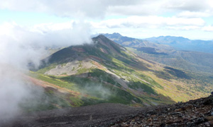 | 感想 : 十勝岳と美瑛岳の縦走。どちらから向かうのが良いのか。時間的にはどちらも同じぐらい。今回、私達は十勝岳は登るより下った方が楽と考え、美瑛岳から十勝岳に向かったが、すれ違った多くの人は十勝岳から美瑛岳のコースであった。さて、どちらが良いのだろう? なお、美瑛岳の登りは、今回は美瑛富士に回ったが、稜線を直接登った方がずっと時間的に有利なようだ。 今回の登山では朝の登り時と下山時が良く晴れたが、縦走時はガスが多かった。十勝連峰は快晴の日でも日中はガスがかかりやすいようだ。ガスや天候の悪いのときはこの縦走路は迷いやすく、風を避ける場所もないから要注意だ。 |