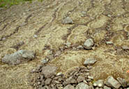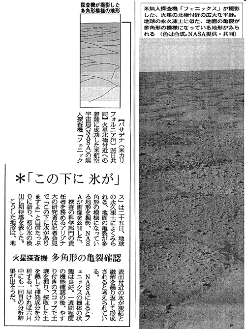 ![]() 米国の火星無人探査機が火星から送られてきた画像に大雪山で見られるような亀甲状の構造土が認められた。永久凍土の上に生じるこのパターンは凍結、融解を繰り返すことにより生じた亀裂に、長い歳月をかけて荒い石が溜まり出来上がると考えられている。 いよいよ火星に氷が発見されるか? 右は大雪山の亀甲模様(曽根敏雄氏写真)。 |