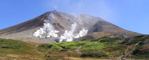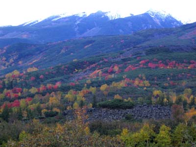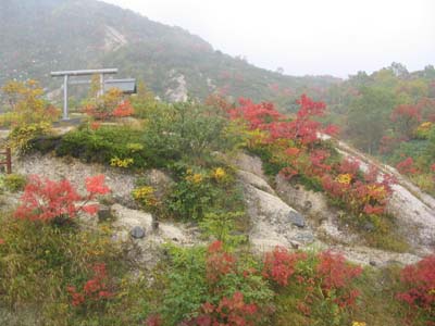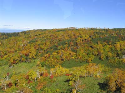 写真を撮って早々に退却。![]() 五色温泉の紅葉、雨の中、ナナカマドが赤かった (平成15年9月30日) 旭岳・姿見平 いい天気になりそう。久しぶりに、姿見に行ってみよう。 ただ、もう紅葉は遅いかもしれない。期待と不安で出発。ロープウエイから見下ろす 紅葉はなかなか良い。 ![]() ロープウエイから見下ろす紅葉 (平成15年9月23日、旭岳温泉) 姿見平は紅葉は終わったようだ。ところどころに、チングルマの赤い葉と種毛。旭岳は雄大。 ![]() 噴煙を上げる旭岳 (平成15年9月23日、姿見平より旭岳) 十勝岳・望岳台 十勝岳の紅葉はどうだろう?以前から気になっていた。 十勝岳の望岳台と十勝岳温泉への山岳道路は、高度が高く、きっと紅葉は見事なはず。天候は悪いけれど ドライブに出かける。望岳台から見る紅葉。曇っていて鮮やかさに欠けるがなかなかなものだ。 ![]() 十勝・望岳台の紅葉 (平成15年10月5日) 少し日が射してきた。道路周辺の紅葉も見事だ。 ![]() 富良野岳方面の紅葉 (平成15年10月5日) |