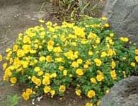 こと。アカネキンバイが黄色の絨毯のように庭を彩ってくれること。 *反 省*やっぱり随分失敗している。 田中澄江さんに、「美しい山の乙女を、 空気の悪い町中にかどわかして、野垂れ死させないで。」と、怒られそうである。 高山植物といっても、その生活環境はいろいろである。 乾燥状態の好きなものから、湿原がいいもので、さまざまである。 もっと、勉強しようと、高山植物の育て方なる本を買って来て読んでみたが、 盆栽風の鉢植えが主で地植えは説明が乏しい。あまり欲張らず、 ひとつひとつを大切に育てなくてはと反省している。 (写真:我が家の高山植物 右上 リシリヒナゲシ 左下 アカネキンバイ) |
