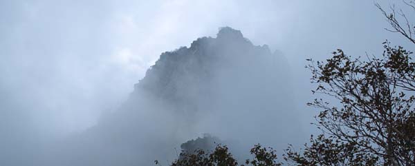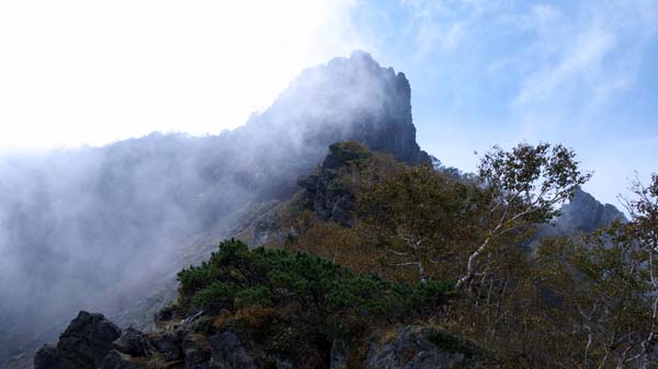 ポロピナイコース 登山口ー 恵庭岳![]() ガスの中から姿を現した山頂の岩峰 |