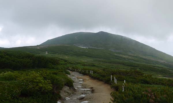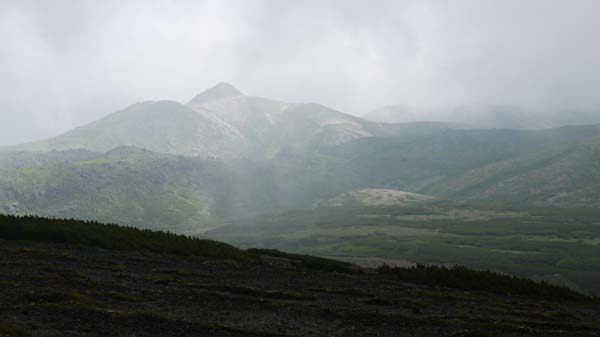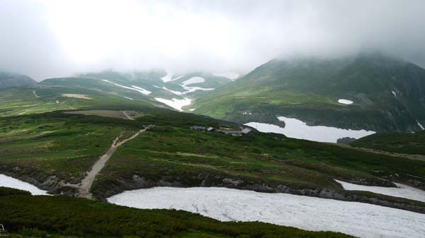 大雪山・久しぶりの黒岳から北鎮岳を目指す。早朝札幌出発。ロープウエイはすいていた。天候はあまり良くない。 ![]() ![]() ( 9合目、まねき岩付近のお花畑 ) 黒岳山頂に到着する。強風、ガスで展望なし。 ![]() ( 黒岳山頂。強風で標識にしがみつく登山者) 諦めて下山もかんがえたが、石室までは行ってみよう。黒岳を下るとお花畑が待っていた。 ( チングルマ・ツガザクラの美しいお花畑 ) 石室までくると、山頂と比べて風は弱い。天候が良くなるのを期待してお鉢平へ向かう。このあたりは雲の平と呼ばれる展望が開け、快適な高原だが今日は見通しが悪い。それでもお花畑が広がっている。 ![]() ( 夫婦池) ( チングルマの群落) ( 川の流れのようなお花畑) お鉢平に着く。お鉢の中はガスで何も見えない。 ![]() ( お鉢平、ガスで何も見えない ) ガスの中、行くか迷ったが北鎮岳を目指す。しかし、しばらく行くと雪渓が現れた。相変わらず強風である。登山を断念して黒岳へ戻ることにする。 ( 黒岳へ戻る) 黒岳に近づくにつれてしだいにガスはうすくなってきた。うっすらと烏帽子岳が姿をあらわした。 ゆっくりと黒岳を登る。歩いてきた雲の平を振り返る。雲に覆われていても、これが大雪! ( うっすらと姿をあらわした烏帽子岳) ( 黒岳の登りから石室を振り返る・・・北鎮岳、凌雲岳は雲に覆われている) |
