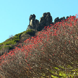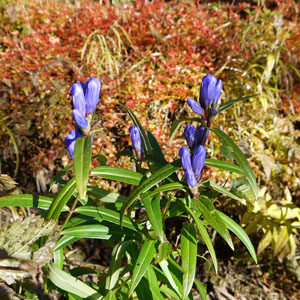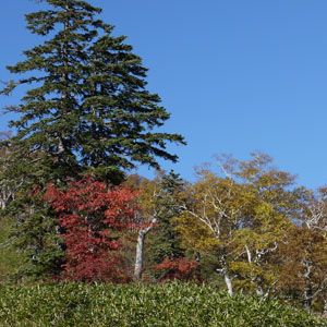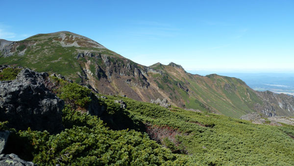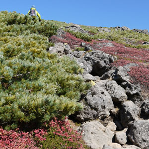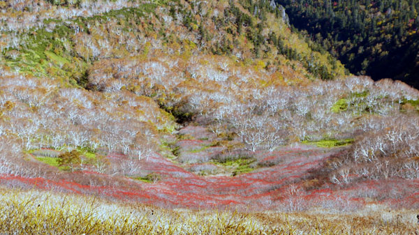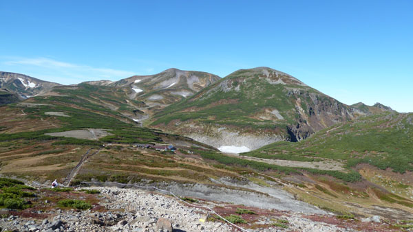 紅葉の状態はどうだろう?1週間ほど前に黒岳の紅葉のニュースが流れていたから、もう少し遅いかもしれない。天気予報は秋晴れが期待出来る。ロープウエイ、リフトを乗り継いで7合目登山口につく。紅葉は終わり晩秋の風情。リフトの足元にはリンドウ。白花もある。 ![]() (ロープウエイ) ( リフト ) ![]() (エゾオヤマリンドウ) ( 残っていた紅葉 ) リフト終点から登山。ニセイカウシュッペを振り返りながら登る。ナナカマドの葉は落ちてしまっているが、赤い実が美しい。 ( ナナカマドとニセイカウシュッペの山並み ) 谷に目を落とせば晩秋の錦絵。 ( 層雲峡の谷の錦絵 ) ![]() (招き岩とナナカマド) ( 黒岳山頂 ) ( 黒岳山頂からお鉢方面を望む ) 石室へ向かう。奥に北鎮岳、手前に凌雲岳。麓に石室が見えてきた。 ![]() ( 遠く北鎮岳、手前に凌雲岳。麓に石室 ) 石室に到着。背後に桂月岳。 ![]() ( 石室の背後の桂月岳。小さな丘の風情 ) 桂月岳への道はメインの登山から離れているので整備されていないので山道らしい。クロマメの木が実をつけ、紅葉になっている。実をつまんで食べると甘酸っぱくブルーベリーのよう。 ![]() ( 岩道のまわりはクロマメの木の紅葉と実) 岩の積み重なった山頂に着く。凌雲岳・上川岳の稜線がつづく。 ( 桂月岳から凌雲岳・上川岳の稜線を望む ) ![]() (山頂から見る黒岳の崖) (記念写真) 石室へ下山、黒岳へ戻る。晴天の中に黒岳の山頂は雄大に聳えていた。 ( 黒岳への登り。背後は北大雪 ) |