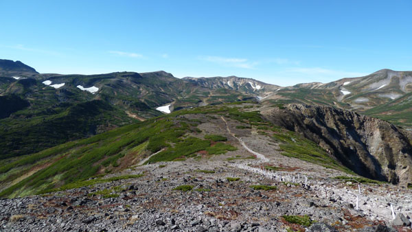 *感想* 「富士山に登って、山岳の高さを語れ。大雪山に登って、山岳の大きさを語れ。」と紀行文を残した、文豪・大町桂月にちなんで名づけられた桂月岳。石室の背後に聳える丘のような小さな山だ。まだ整備されていないので昔の山らしい風情が残っている。夏にはコマクサが咲く。黒岳からちょっと足を延ばすのにいい山だ。 |