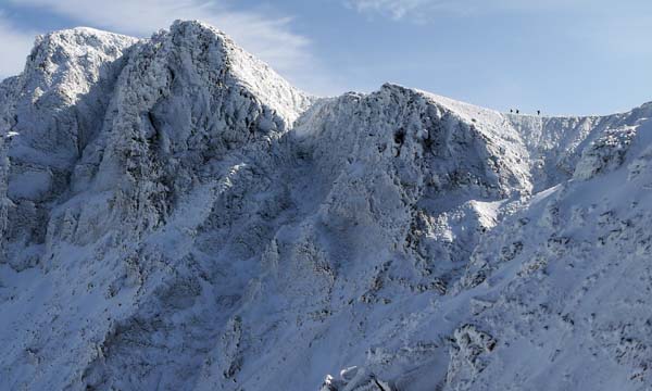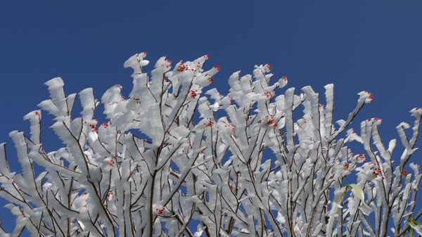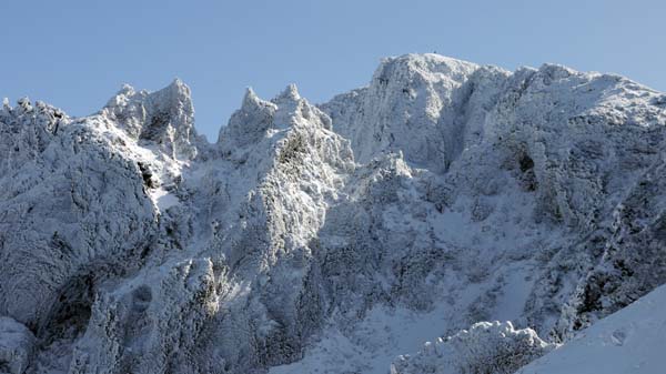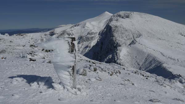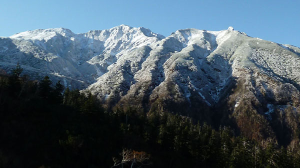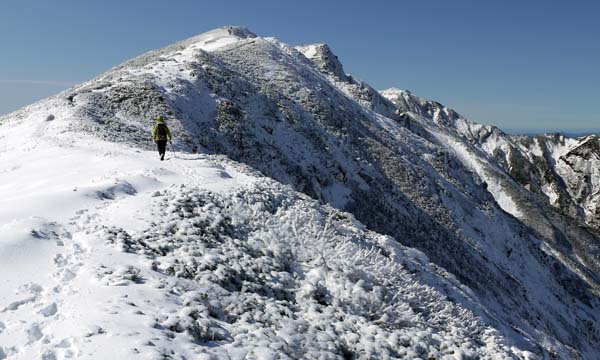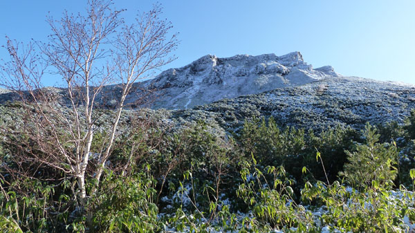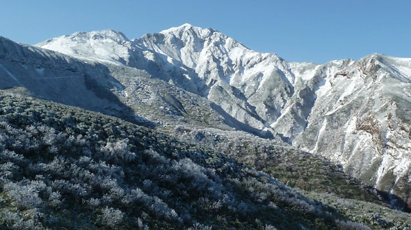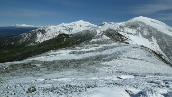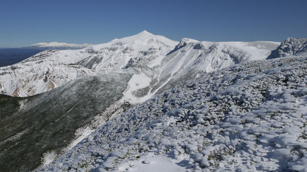 天気は快晴。数日間の悪天で山は雪化粧。新雪の十勝岳を見に上富良野岳を目指す。登山口の十勝岳温泉から富良野岳が見える。山頂は白い。いつも登る道だが、出発してまもなく右手のふみ跡から見あげるる富良野岳は雄大。 ( 駐車場から富良野岳 ) (崖尾根コースはまだ通行止め) (右手のふみ跡ー展望台から見あげるる富良野岳) 左手に三段山。崖尾根コースはまだ通行止め。三段山へのこのコースは手軽で見晴らしも良いので、早く再開通してほしい。 (三段山) 安政火口は雪に覆われている。 ![]() (雪の安政火口) 安政火口から右手にトラバース。樹氷に覆われた枝にナナカマドの赤い実が美しい。 富良野岳が見えてくる。 (ナナカマドの赤い実) (富良野岳が見えてくる) カミホロ分岐からD尾根への急登。稜線に出ると白く輝く十勝岳の雄姿。荒々しい八つ手岩。上ホロカメットク山へ向かう登山者が見える。 ( 白く輝く十勝岳 ) ![]() (荒々しい八つ手岩と上ホロカメットク山) ![]() (上ホロカメットク山へ向かう登山者の列) 上富良野岳に到着。標識には海老のしっぽ。記念撮影後、天候が良いので、三峰山へ縦走することとする。正面に聳える富良野岳、背後には十勝岳。新雪の稜線を行く。 ( 上富良野岳で記念撮影 ) ![]() (標識についたエビのしっぽ) ![]() ( 三峰山へ向かう) 十勝岳を振り返りながら富良野岳へ向かう。しだいに富良野岳が大きく聳える。 ( 十勝岳を振り返る ) ( 富良野岳が大きく聳える ) 富良野岳分岐に着く。三峰山、十勝岳そしてその左に雪の大雪山・旭岳が輝いている。富良野岳は登らずここから下山する。十勝岳はなおも美しく聳えていた。 ( 分岐から三峰山、十勝岳そしてその左に雪の大雪山・旭岳 ) (下山路、十勝岳はなおも美しく聳えていた) | ||