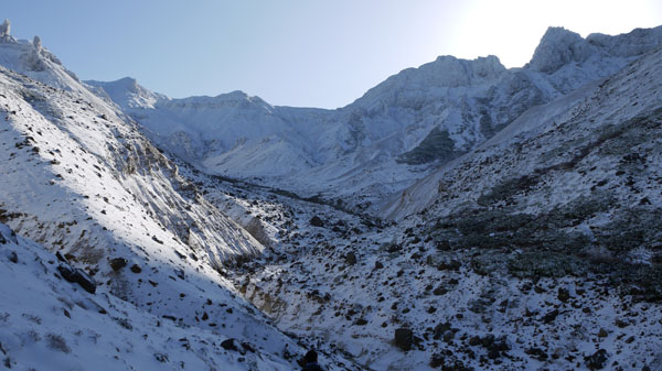 *感想* すばらしい新雪の山だった。雪化粧した十勝岳は美しく聳え、富良野岳の雪の岩肌はまぶしく輝いていた。もう二度とこんな景色には会えないかもしれない。山を歩く幸せを心から感じた山旅だった。 | ||