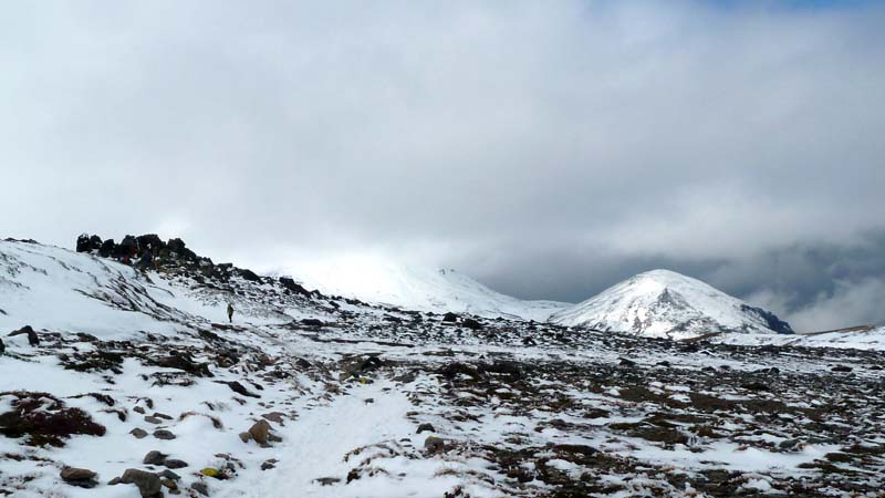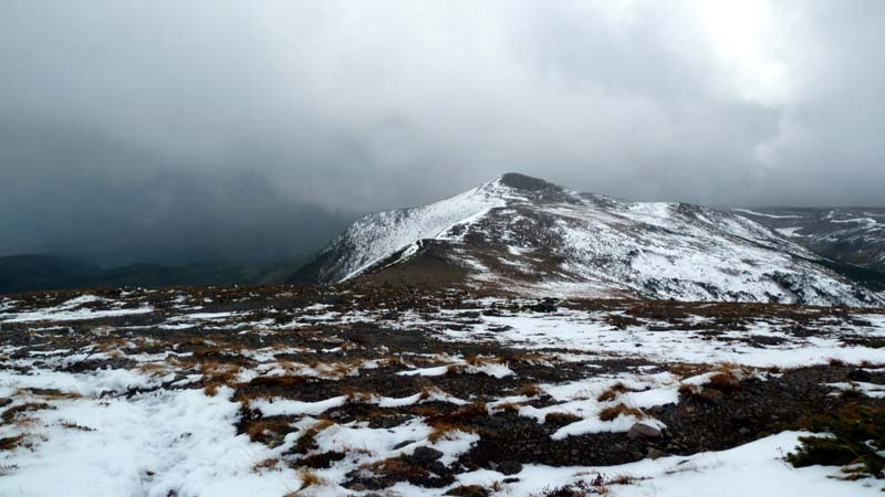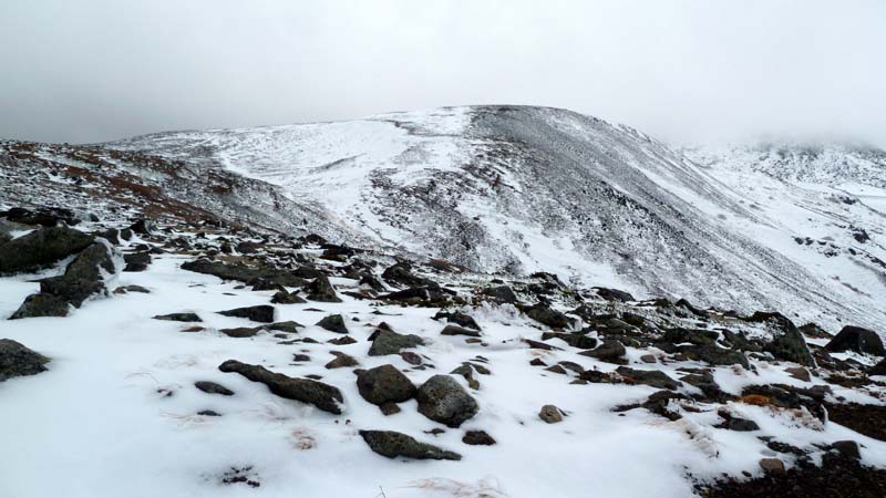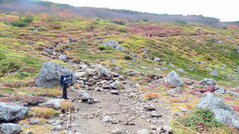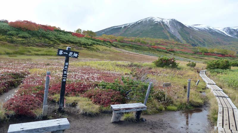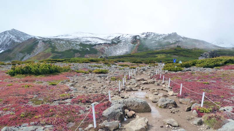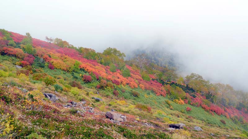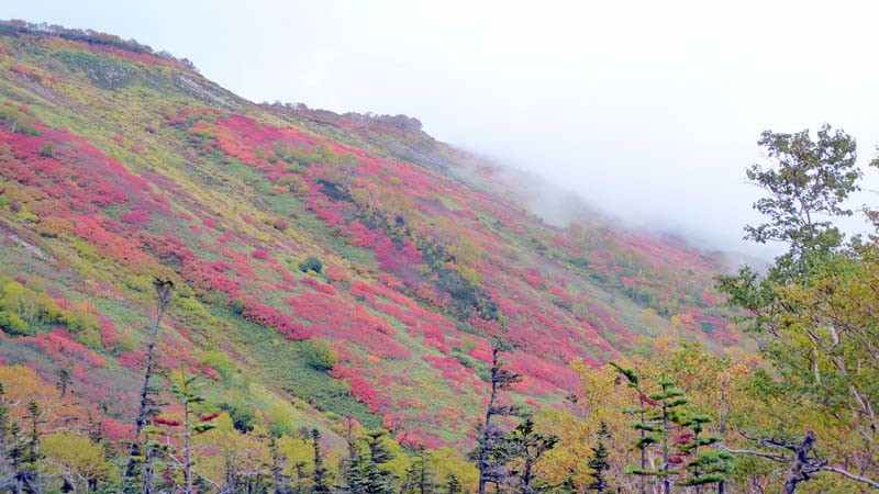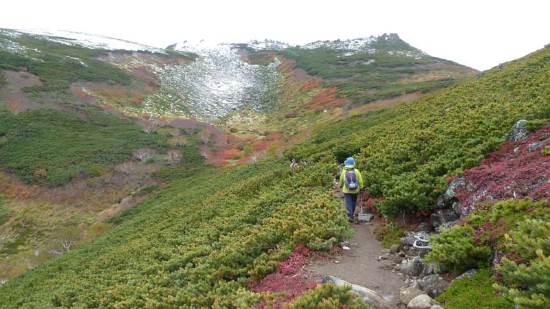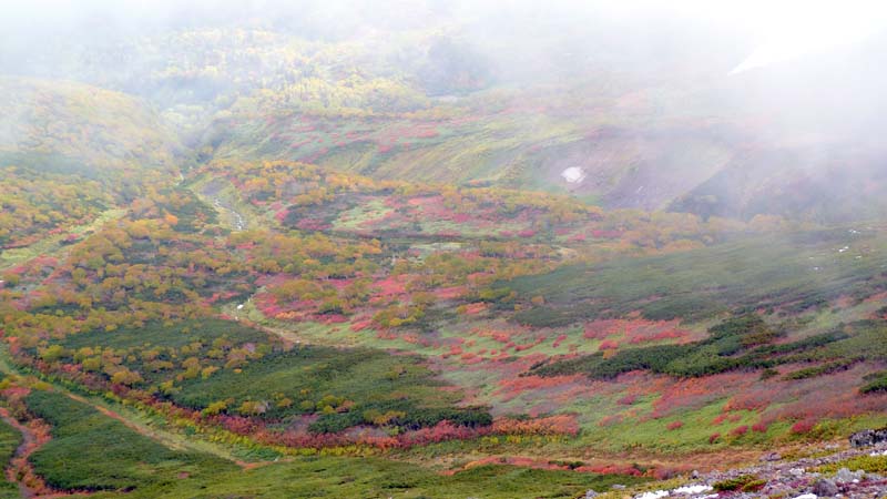今年は紅葉が見事との報道。久し振りで紅葉の赤岳・緑岳縦走に行こう。この時期は銀泉台、高原温泉へのマイカー規制がおこなわれ、シャトルバスが走るのでうまく合わせると縦走できる。大雪湖の駐車場に車を置き満員のバスで銀仙台へ。銀泉台から15分ぐらい登ると第一花園の紅葉が目の前に広がる。ここはいつ見ても見事。今日は曇りなので、鮮やかさはいまいち。 ( 第一花園斜面の紅葉、今日は曇りなので、鮮やかさはいまいち ) 第一花園から斜面を見下ろすとナナカマドの紅葉がうつくしい。 ![]() ( 第一花園から見る紅葉 ) ハイマツ帯を過ぎると第二花園に着く。ここは遅くまで雪渓が残り、夏はお花がきれいなお花畑だ。 ( 第二花園 ) ![]() ( 奥の平、静かな秋の風情のお花畑) 駒草平に着くと、見晴しが開ける。こまくさは姿を消し、チングルマの紅葉が広がる。 ![]() ( 駒草平から第三雪渓を望む ) ここからは気持ちの良い平坦な道がつづく。正面に第3雪渓が見えてくる。先日降った雪がまだら状に残っている。ここも紅葉がきれいなところ。 ( 第三雪渓、まわりは紅葉 ) 第三雪渓を超えるとまわりは寒い、雪の世界。冬山になる。今日は冬山装備ではないが、暖かいパーカーなどを着込んで登山続行。この時期はこんなこともある。雪の第四雪渓を登る。 ![]() ( 雪の第四雪渓を登る ) 赤岳に到着。北鎮岳などはガスに覆われている。 ![]() ( 赤岳の岩峰、背後に凌雲岳 ) 赤岳から小泉岳を望む。今日の装備で先に行けるか?それとも戻るべきか?しばし考える。体力は二人とも大丈夫。道も何度も歩いているので迷うことはない。天候は良い方に向かっているはず。なにか突発的な出来事があれば尾根で夜を過ごす装備はなく凍死になる。現在、風がなく見通しもよいので緑岳へ縦走する。白雲岳は雲の中で見えない。 ![]() ( 平らな小泉岳 ) ![]() ( 小泉岳から・・・これから行く緑岳をのぞむ ) 小泉岳から左に曲がり緑岳を目指す。白雲岳は雲の中で姿は見えない。ましてトムラウシは見えるはずがない。白黒の平原を進む。ときおり、冷たい風が吹く。緑岳がしだいに大きくなってきた。 ( 緑岳がしだいに大きく見える ) 白雲小屋への分岐に着く。雲の切れ目から白雲岳が姿を現した。 ( 緑岳の下の白雲小屋への分岐、白雲岳が姿を現す ) 緑岳山頂に着く。しかし何も見えず。寒くて早々に下山。緑岳下山中に天候が回復してくる。ガスの切れ目から紅葉の絶景! この景色をみるためにここまでやってきた。見れてよかった・・・。 ( 紅葉の絶景 ) 紅葉を見おろしながら下る。ここは急な岩の道なので下るのも大変、登りはもっと大変。ハイマツ帯を過ぎると 雪のない紅葉の世界。第二花畑、第一花畑から緑岳を振り返りながら下山する。チングルマの紅葉と冠雪の緑岳のコントラストが美しい。 ![]() ( チングルマの第一花畑から緑岳を振り返る ) |