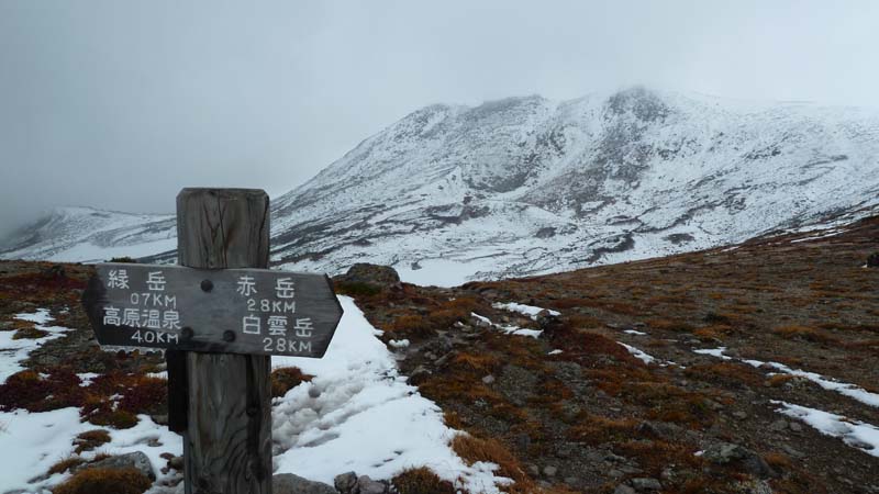 | 感想 : この時期、シャトルバスを利用して何度か縦走しているが、雪に会うのは初めて。数日前の雪が残り、天候は回復してきているが、曇りで紅葉の鮮やかさはいまいち。明日は最高の天気になる予報。ちょっぴり残念。 今回は出発が遅かったので、高原温泉からの最終シャトルバスの最終時刻(16:00)に間に合うかちょっと心配した。 |