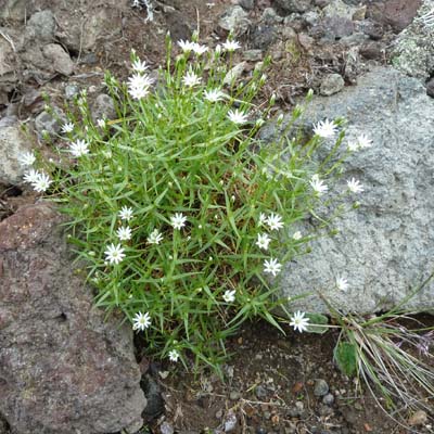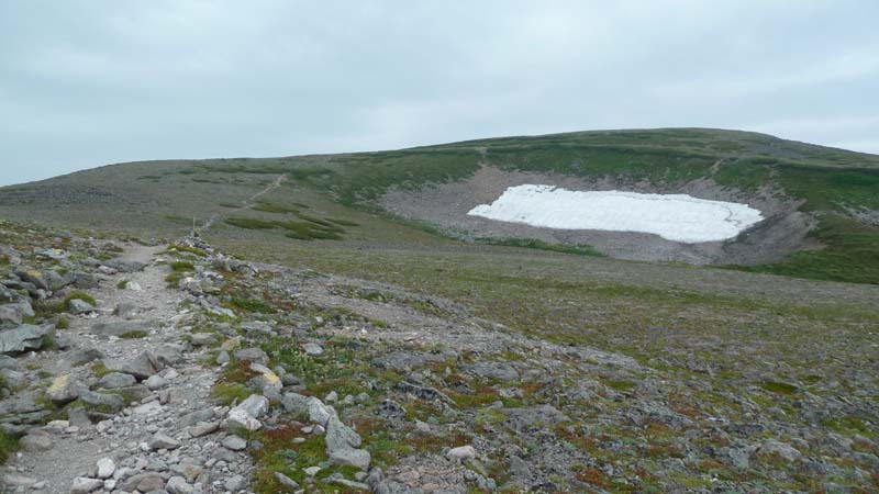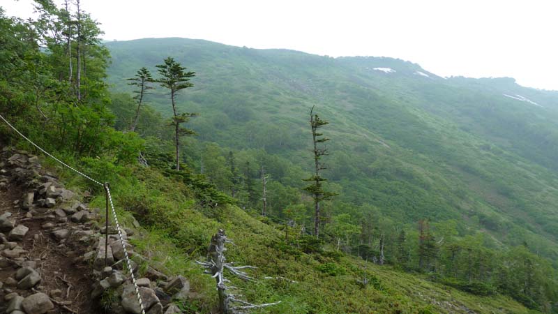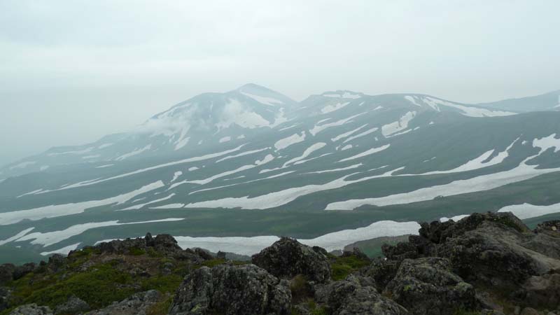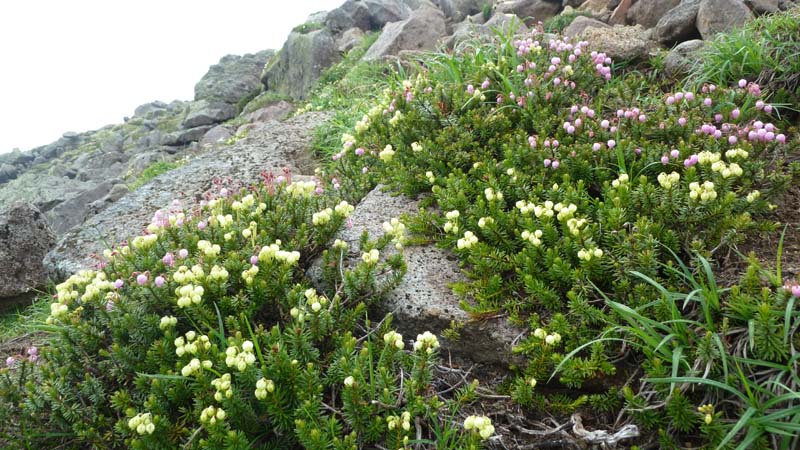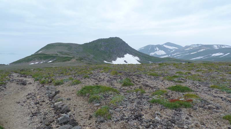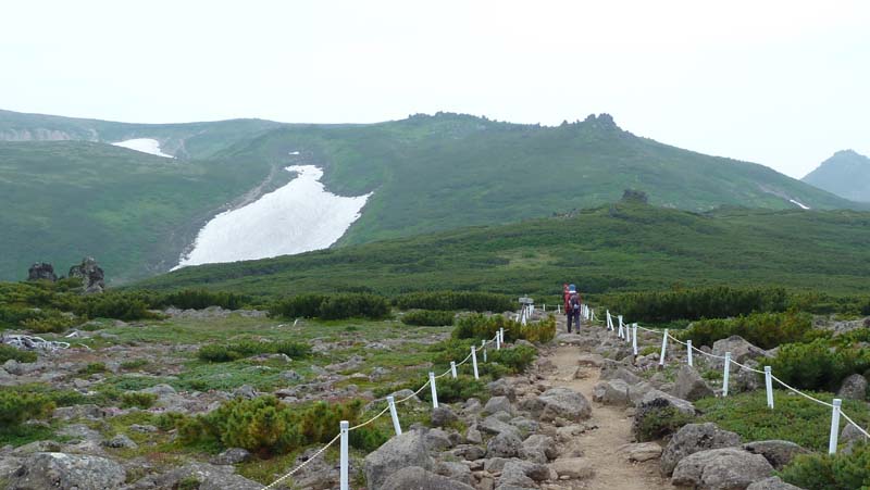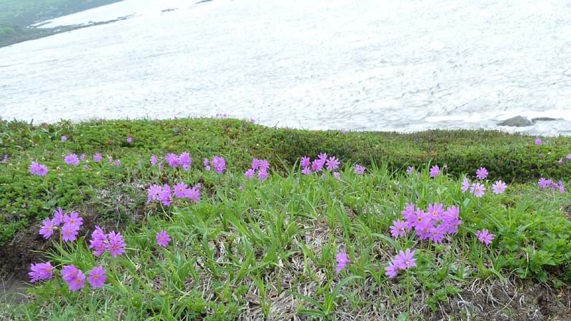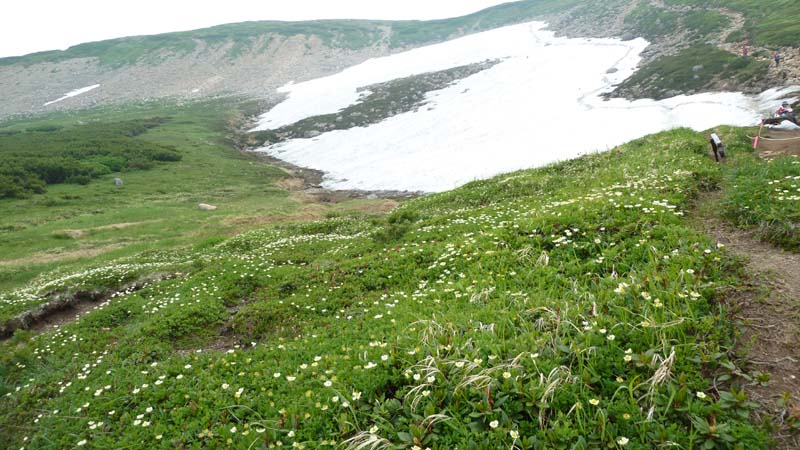 大雪山・赤岳登山を計画する。天気は曇りの予報。銀泉台の駐車場はすいていた。 出発するとまもなく 第一花園の斜面が見える。 ここは秋の紅葉が見事だ。 ( 第一花園の斜面が見える・・・ここは秋の紅葉の絶景ポイントだ) 第一花園までは林の中、ゴゼンタチバナ カラマツソウが咲く。ゴゼンタチバナは葉が6枚のものに 花が咲く。4枚の葉のものは花をつけない。第一花園の花を見ながら、斜面をトラバース。 ![]() ( ゴゼンタチバナ カラマツソウ ) ![]() ( ミヤマリンドウ エゾヒメクワガタ ) ハイマツのトンネルを過ぎると第二花園に到着。雪渓が残っている。 雪が解けたところにはお花畑。 ( 第二花園は雪渓、雪が解けたところには花が咲く) ![]() (雪解けあとに咲く エゾコザクラ) 第二花園を過ぎると、静かな 奥の平。ここはチングルマの群生地。 ( 奥の平、ここはチングルマの群生地 ) いよいよ稜線にでるとそこは駒草平。コマクサがいたるどころに咲く。 ( 駒草平のコマクサ ) 平らな道がつづく。正面に第三雪渓がみえてくる。第三雪渓はつらい登りだが、周りはお花畑。花 を見ながらゆくり登る。 ( 第三雪渓がみえてくる ) ![]() ( エゾコザクラ アオノツガザクラ ) 第四雪渓を行く。ここも美しいお花畑だ。 ( 第四雪渓 まわりはお花畑) 第四雪渓を登るとガレ場となる。岩陰にエゾツツジが咲いている。 赤岳の山頂の岩峰が見えてきた。 ( エゾツツジ) ( 赤岳の山頂の岩峰 奥は北鎮岳 ) ( 赤岳から望む旭岳 ) 天候は良くないが体調がいいので白雲岳まで行くことにする。なだらかな小泉岳へ向かう。 不毛の大地に見えるガレ場の道だが、よく見るといろいろな花が咲いている。 ![]() ( なだらかな小泉岳へ向かう) ![]() ( チシマギキョウ イワギキョウ ) ![]() ( クモマユキノシタ チシマツガザクラ) ![]() ( エゾタカネツメクサ エゾイワツメクサ ) 緑岳の分岐が小泉岳。北海岳の分岐から白雲岳へ向かう。なだらかな火口跡の道を進む。 斜面はお花畑。 (小泉岳から白雲岳を望む ) (白雲岳の火口の中を行く ) ( 黄色のアオノツガザクラと赤いエゾノツガザクラ) 山頂に着く。空は曇っているが白雲岳は大雪山の中心だ。旭岳を望む。 ( 白雲岳から展望 旭岳を望む ) ![]() ( 白雲岳の山頂) ( 白雲岳下山路からの展望 ) 小雨が降ってくる。次第に雨脚が強くなる。雨具をかぶっての下山となった。 |