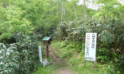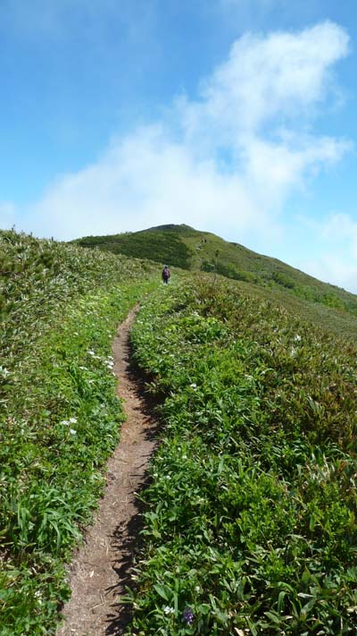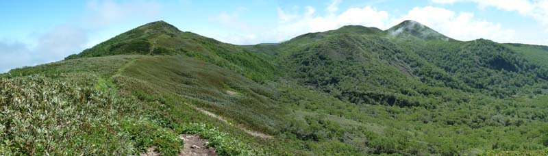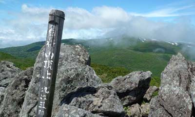 この時期は根曲がり竹の竹の子採りがにぎやか。新見峠の駐車場も満車。道路の縦列駐車の列に車を止めて登山開始。 はじめは日陰の笹竹の中を登る。時々、竹の子を採りながら登る。日陰を好む花が咲く。 ![]() (登山口) (エンレイソウ) ![]() (ヒトリシズカ) ( ツバメオモト ) 周りが開けてくるとまもなく稜線にでる。正面にシャクナゲ岳、これから登る白樺山が見える。 ( 稜線からの展望 左端:白樺山 右端:シャクナゲ岳 ) 稜線の道を白樺山を目指す。ハクサンボウフウ、チイシッマフウロウ、ハクサンチドリが咲く。美しく快適な道だ。 ( 気持ちの良い尾根 ハクサンボウフウの白い花道を行く ) ![]() (ハクサンチドリが鮮やかに咲く) ![]() (チシマフウロ) (シラネアオイ) ![]() (エゾカンゾウ) (まだ少し残っていたアズマギク) 今年は、残念ながら山頂下のアズマギクのお花畑はもう終わっていた。 ( 白樺山の山頂 シャクナゲ岳と正面に見える ) 少し休んでから下山する。下山時、目国内岳が姿を見せる。雲が美しい。 ( 目国内岳が姿を見せる・・・ この写真をダウンロードして壁紙・背景にどうぞ! ) |