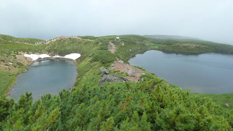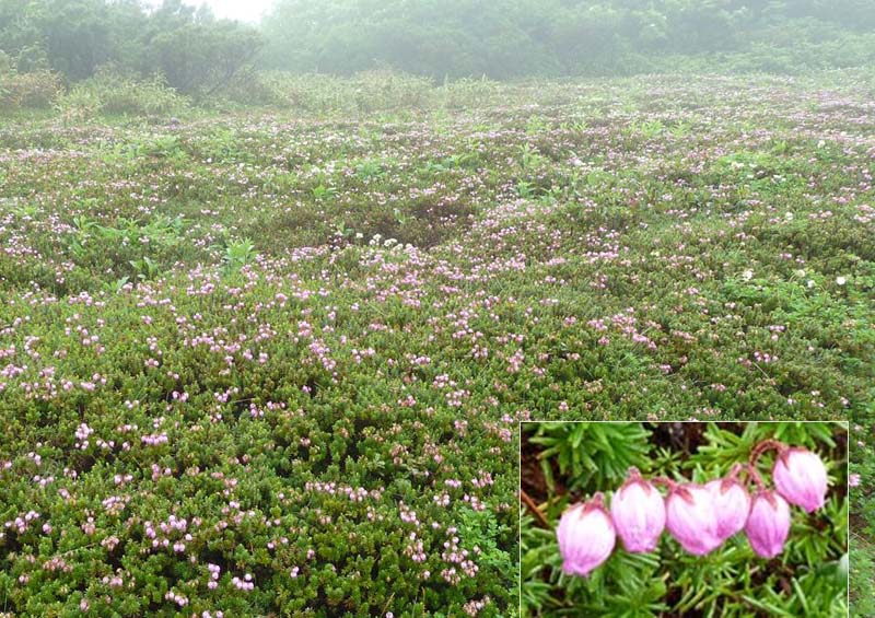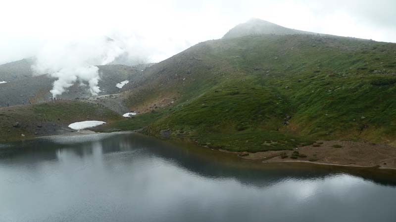 大雪山・旭岳登山を計画するも天気は回復せず、旭平(姿見の池)の散策とする。 ガスで周りの視界はない。それでもチングルマが広がる。 ( ガスで辺りは見えない) ( それでもチングルマが広がる) ![]() ( エゾノツガザクラの群生) まず、裾合平のチングルマの大群生地を目指す。しかし、もう最盛期は過ぎていた。 ( チングルマの大群生地。しかし、もう最盛期は過ぎていた) 夫婦池の戻る。一瞬のガス切れ目から夫婦池が姿を現した。ここから姿見の池へ向かう。 ( ガス切れ目から夫婦池が姿を現した ) 姿見の池の鐘はガスの中。旭岳は見えない。池の奥に噴煙が見える。 ( 姿見の池) ( 旭岳の山頂は見えない。池の奥に噴煙が見える) 残念な天気ではあったが、可愛い高山植物をみながらロープウエイ駅へ戻った。 ![]() ( チングルマとエゾノツガザクラ) ![]() ( イソツツジとイワブクロ) ![]() ( キバナシャクナゲ ツガザクラ ) ![]() ( メアカンキンバイ コマクサ) |