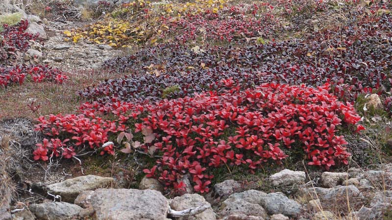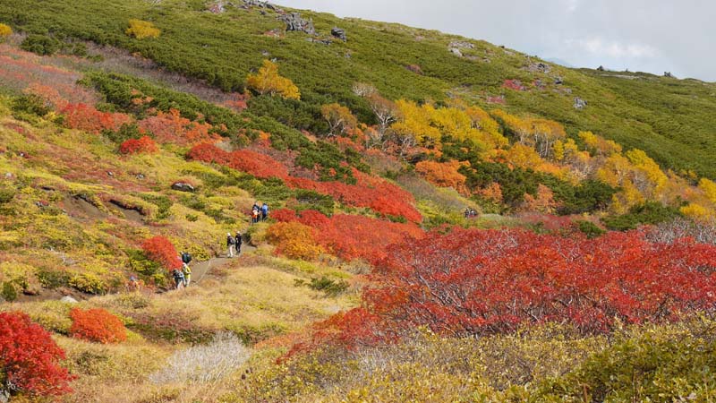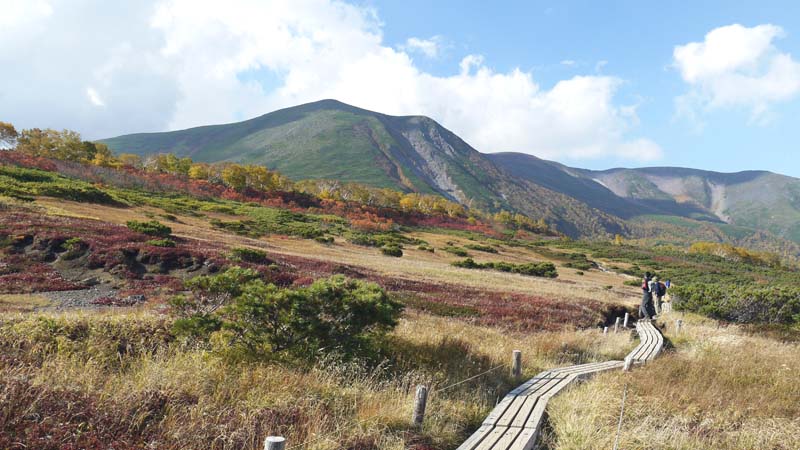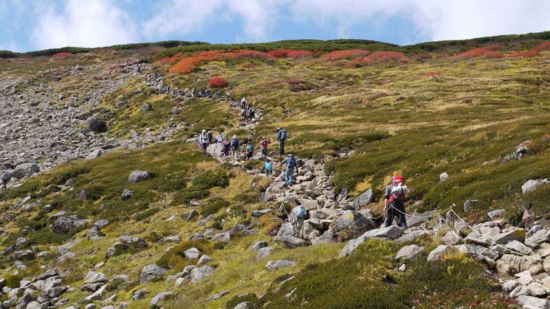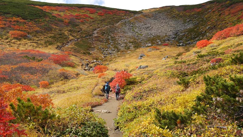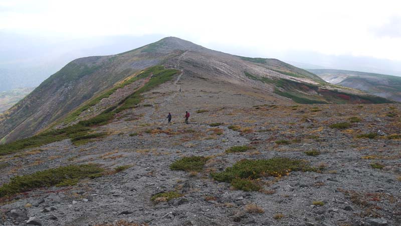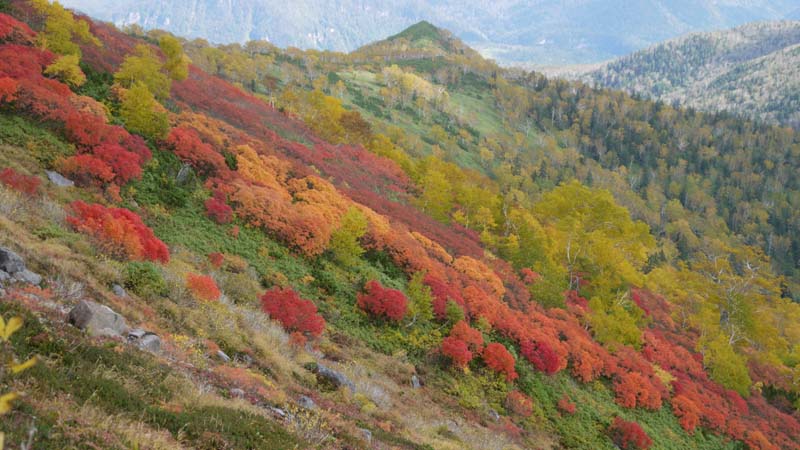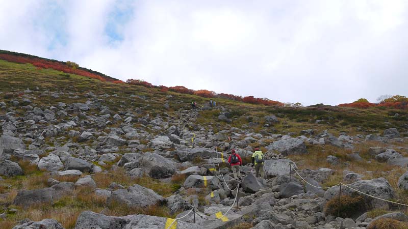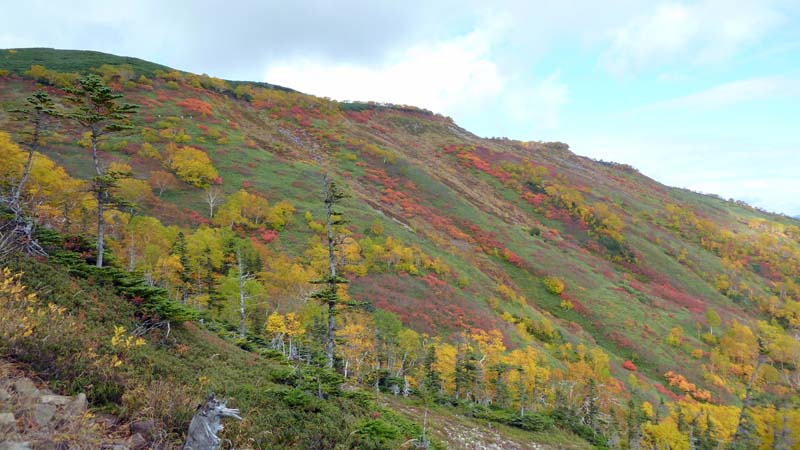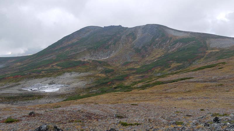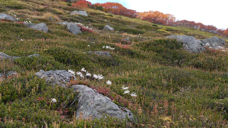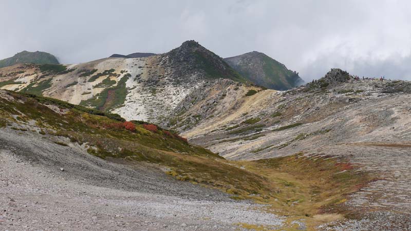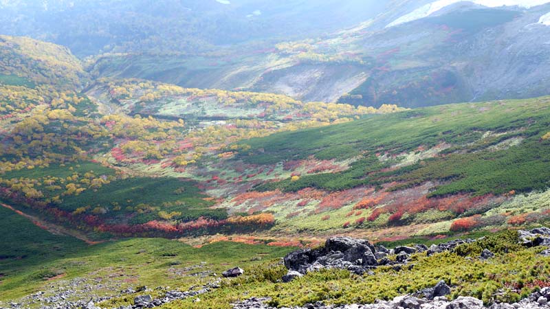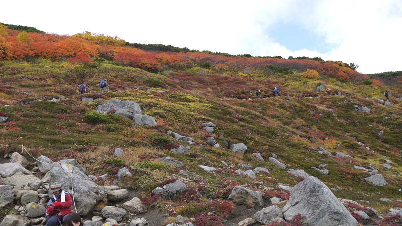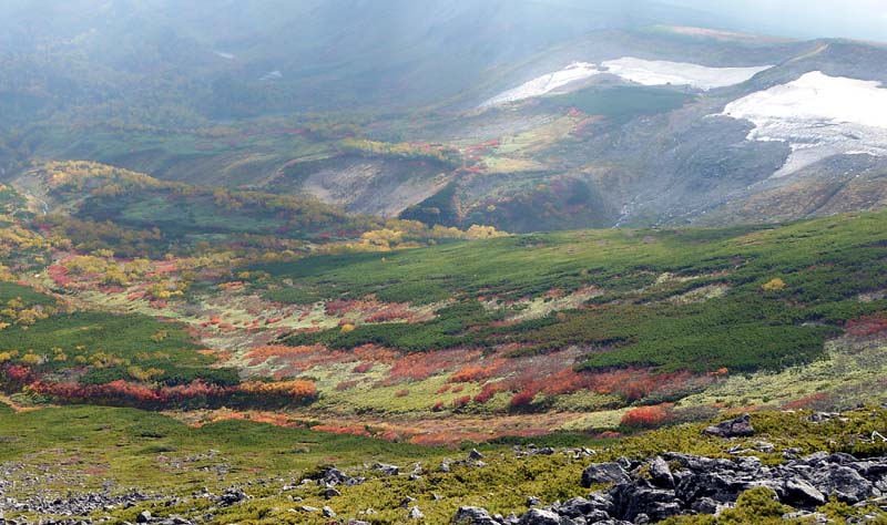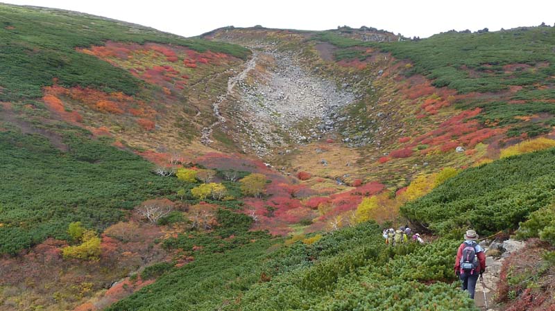 今年も紅葉の赤岳・緑岳縦走に行こう。この時期はシャトルバスが走るので、大雪湖の駐車場に車を置くと銀泉台ー高原温泉の縦走が できる。満員のバスで銀仙台へ。銀泉台から15分ぐらい登ると第一花園の紅葉。ここはいつ見ても見事。 ( 第一花園斜面の紅葉 ) 第一花園から斜面を見下ろすとナナカマドの紅葉がうつくしい。 ![]() ( 第一花園から紅葉を見下ろす ) ハイマツ帯を過ぎると第二花園に着く。夏はお花がきれいなお花畑だ。チングルマの綿毛が秋の風情。 ( 第二花園 ) ![]() ( チングルマの綿毛が秋の風情) ![]() ( 紅葉に染まる奥の平 ) 駒草平からは気持ちの良い平坦な道がつづく。ウラシマツツジが赤く紅葉している。 ![]() ( ウラシマツツジ ) 正面に第3雪渓が見えてくる。雪渓はない。紅葉が美しい。 ![]() ![]() ![]() ( 紅葉の第三雪渓 ) 第三雪渓を過ぎ、第四雪渓が最後の登り。 ![]() ( 第四雪渓を登る ) 赤岳に到着。旭岳方面を望む。旭岳は雲の中で見えない。 ![]() ( 赤岳の岩峰 ) ![]() ( 旭岳方面を望む ) 小泉岳へ向う。振り返ると赤岳の岩峰と烏帽子岳、その間に黒岳。 ( 赤岳の岩峰を振り返る ) 緑岳、白雲の分岐から少し緑岳へ向うと小泉岳の標識が立っていた。昨年はなかったと思う。 ( 小泉岳の山頂の標識・・・背後は白雲岳 ) 緑岳がしだいに大きくなってきた。 ![]() ( 緑岳がしだいに大きく見える ) 白雲岳と白雲非難小屋が姿を現した。 ( 茶色の白雲小屋と白雲岳 ) ( 緑岳山頂 ) 紅葉を見おろしながら緑岳を下る。絶景だ! ![]() ( 紅葉の絶景 ) 紅葉を見おろしながら下る。ここは急な岩の道なので下るのも大変、登りはもっと大変。ハイマツ帯を過ぎると 第二花畑、第一花畑から緑岳を振り返りながら下山する。 ( チングルマの第二花畑から緑岳を振り返る ) |