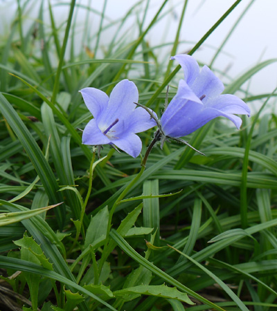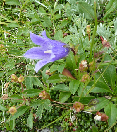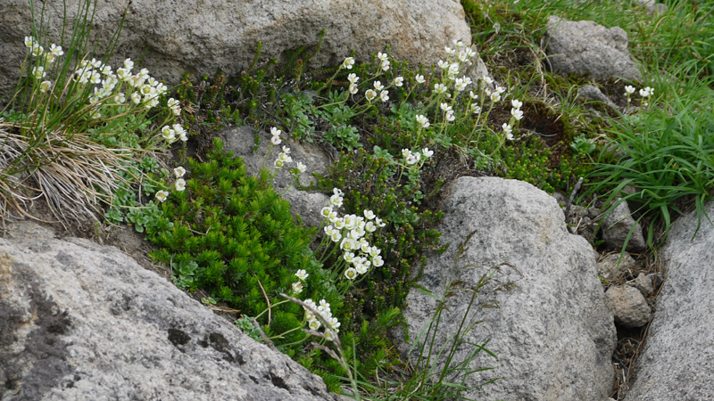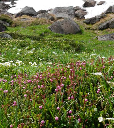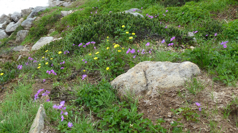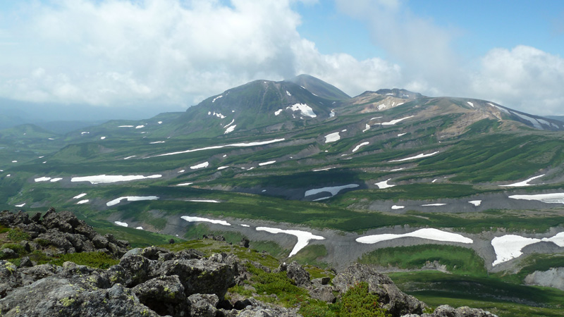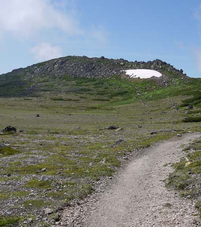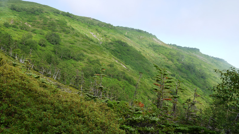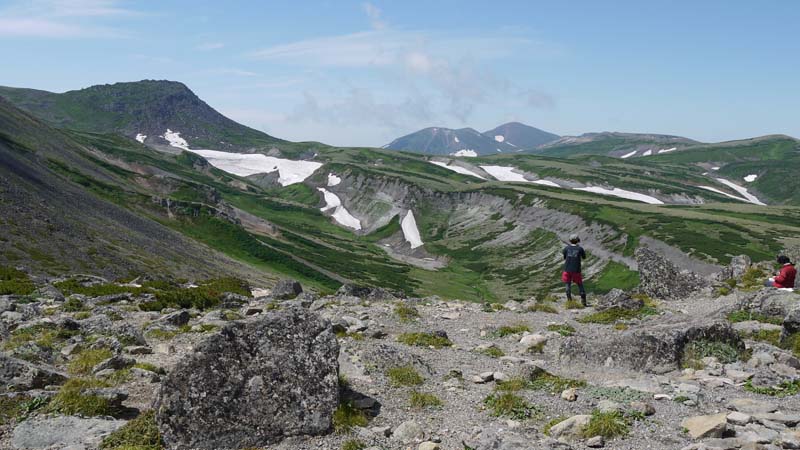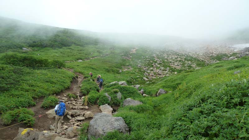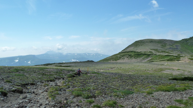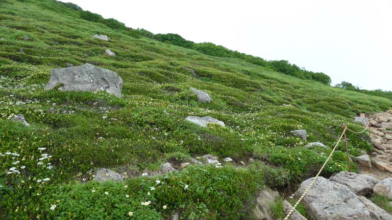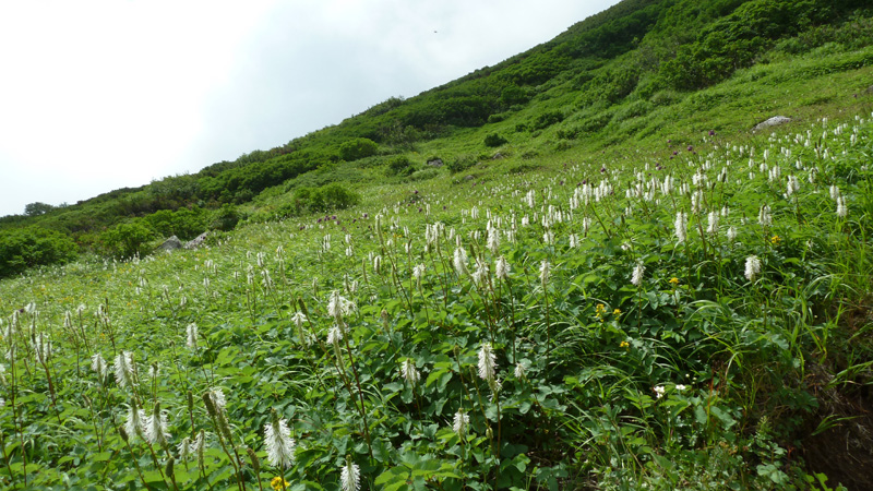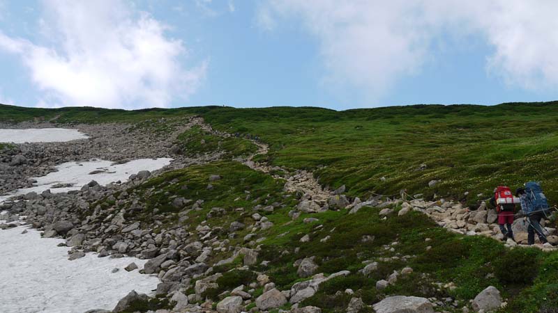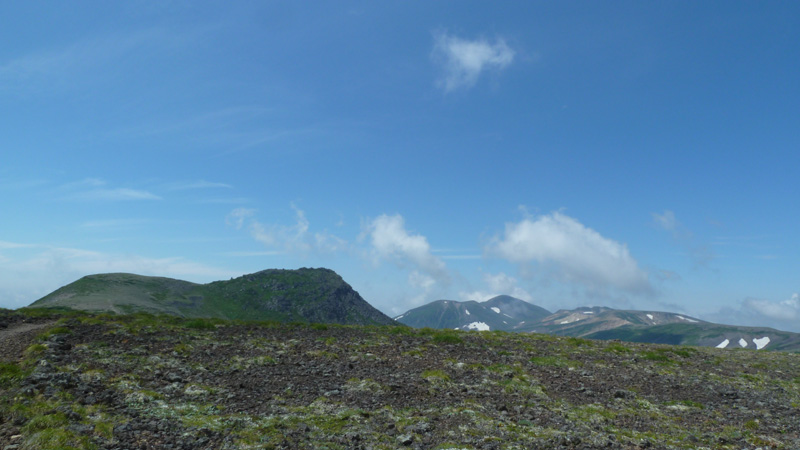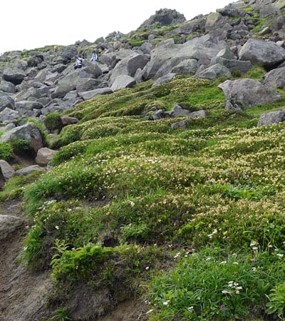 昨年は雨の白雲岳であったが、今年はどうか?天気は晴れ・曇りの予報。銀泉台から出発するとまもなく 第一花園の斜面が見える。 ここは秋の紅葉が見事だ。 ( 第一花園を望む・・・ここは秋の紅葉の絶景ポイントだ) 第一花園を過ぎ、第二花園に到着。今年は残雪はない。チシマクモマグサがかわいらしい。 遅咲きのチングルマやアオノツガザクラが咲いている。 ![]() ( 第二花園・・・今年は残雪はない ) ![]() ( チシマクモマグサ ) ![]() ( 遅咲きのチングルマやアオノツガザクラ ) 奥の平を過ぎると稜線、そこは駒草平。すでにコマクサは最盛期を終え大多数は枯れているが、 残っていた深紅のコマクサに目を奪われる。 ![]() ( 駒草平に残っていた深紅のコマクサ ) 水溜りのところに永久凍土にできるという亀甲状構造を見つける。この地下に永久凍土があるのだろうか? (永久凍土にできるという亀甲状構造? ) 第三雪渓に着く。 雪渓はもうわずかのみ。まわりはお花畑。タカネトウウチソウの群落がみられた。 ![]() ( 第三雪渓・・・ 雪渓はもうわずかのみ ) (タカネトウウチソウ ) ![]() ( アキノキリンソウ エゾヒメクワガタ ) 第四雪渓を行く。ここは雪渓が残っている。お花畑にはまだ色とりどりの花が咲いている。 ( 第四雪渓を登る ) ( エゾコザクラ ミヤマキンバイ ) 第四雪渓を登るとガレ場、まもなく赤岳の岩峰が見えてきた。 ( 赤岳の山頂の岩峰 ) 正面に後旭岳と旭岳。左に白雲岳の一部が見える。 ( 赤岳から望む旭岳・・・正面一番奥 ) 休憩して、昼食。さらに白雲岳へ出発。周りをよく見ると高山植物がたくさん咲いている。 ( 正面に白雲岳・・・奥に旭岳を望む ) ![]() ( チシマツガザクラ エゾイワツメグサ) ![]() ( チシマギキョウ イワギキョウ ) なだらかな小泉岳へ向かう。山頂はどこかわからない。左手遠くにトムラウシ山が姿を見せた。 ![]() ( 左手遠くにトムラウシ山 ) 白雲分岐に荷物を置き、アタック開始。平らな火口跡を進む。最後の岩場の周りはお花畑。 ![]() ( 正面に白雲岳 お花畑が美しい ) ![]() ( まだきれいに咲いていたチングルマやツガザクラ ) 山頂に到着。ここは大雪山の中心。雄大な眺めに圧倒される。 (白雲岳からの展望・・・後旭岳~旭岳~熊ヶ岳~間宮岳の山並み ) ( 記念写真 ) 白雲からの下山。正面に小さな桂月岳・黒岳・特徴ある烏帽子岳。 ( 左から小さな桂月岳、黒岳、特徴ある烏帽子岳。沢をはさんで赤岳 ) 帰路、小泉岳の上空に夏の白い雲が湧いていた。 ![]() ( なだらかな小泉岳の上空にわいた白い雲 ) |
