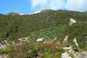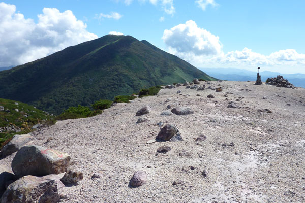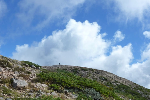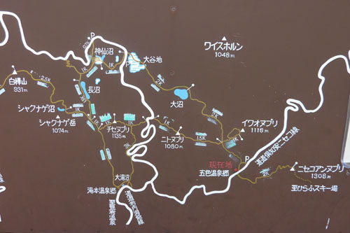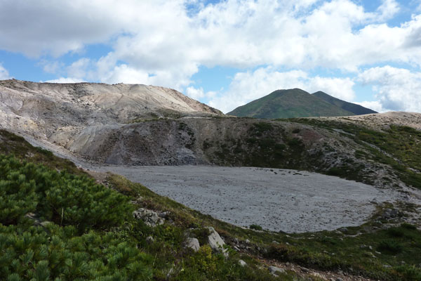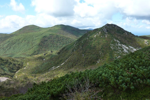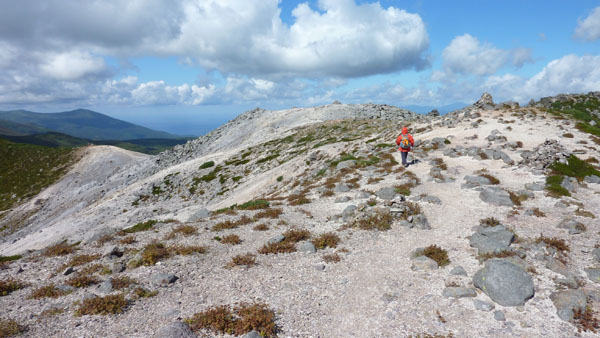 台風10号が釧路沖に去り、天気が回復するというので、イワオヌプリに向かう。 ![]() ( ニセコの概念図 ) 風が強い。全体的には曇り模様。登るか迷ったが、天気は次第に晴れるはず。五色温泉から登山開始するイワオヌプリの山頂がわずかに顔を出している。右側が山頂だ。最初の登りの急斜面がに丸太の階段が出来ていた。なかなか登りやすい。 ![]() ( わずかに顔を出すイワオヌプリ) (新しく出来た丸太の階段) 最初の登りを過ぎると平坦な道がつづく。やがて広場。正面にニトヌプリが見える。ここを右手に下り、5分ほどで視界が開け、イワオヌプリの斜面と右手にはニセコアンヌプリ遠望出来る。ここは大沼分岐。標識があり、そのまま左に行くと大沼、イワオヌプリは右の尾根に登る。 ![]() ( 広場からニトヌプリ双頭・・・右が山頂) (イワオヌプリの斜面・・・山頂は見えない) ![]() ( ニセコアンヌプリ遠望) (大沼方面の標識) いよいよガレ場の登り。登ってゆくと左手にニトヌプリとその登山道と小さいながら鋭い山頂の小イワオヌプリが見える。 ( 双頭のニトヌプリとその登山道 ) 急斜面を過ぎると広いガレ場。前を行く登山者と湧き上がる雲。風は強い。 ( 前を行く登山者と湧き上がる雲 ) 山頂に着く。正面に ニセコアンヌプリが雄大に聳える。前に登った登山者も下り、山頂は無人。 羊蹄山はセコアンヌプリに隠れて見えない。 ![]() (イワオヌプリの山頂、正面にニセコアンヌプリが聳える) ニセコアンヌプリを眺めながら、軽く昼食を食べ火口を一周するコースで下山する。 ![]() ( 火口を一周するコースで下山 ) 大沼とその右手にワイスホルンのなだらかな山容が美しい。背後には岩内の街並みと日本海が見える。 ( 大沼とワイスホルン) 振り返ると イワオヌプリを目指す人影。ニセコアンヌプリが大きく聳えていた。 ( イワオヌプリを目指す登山者の人影 ) |