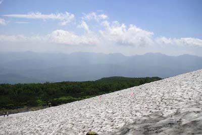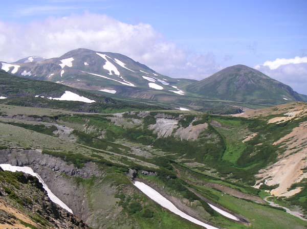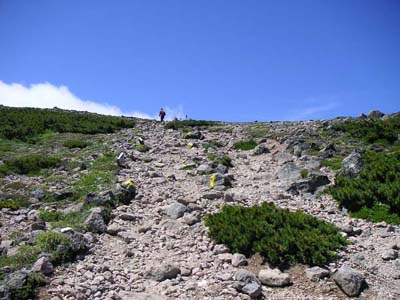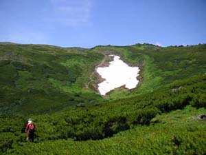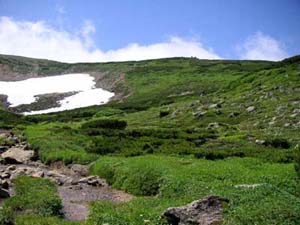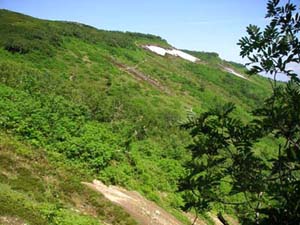 快晴の天気、気温も高いとの天気予報。夏の山ならやはり大雪。何度も来ている 銀泉台に入る。ここはすでに1500mの高さがある。歩き始めて間もなく第一花園の斜面が見える。 ![]() (第一花園を望む 雪渓のそばの斜面) (花は少ない第一花園) 第一花園はチングルマ、ツガザクラなどがところどころに咲いているが、花の数は少ない。 第一花園を過ぎ、ハイマツ帯に入る。雪解け水の音が聞こえ、間もなく第二花園となる。 ここはチングルマとコザクラの一面のお花畑のはず。残念。今年はまだ雪渓。 まだ早いだろうと予想はしていたが、少しがっかり。たぶん花が咲くのは8月末になるだろう。 ![]() (第二花園 雪渓に埋もれている) 先へ進む。次は小さなお花畑、奥の平。 チングルマとアオノツガザクラがなかなかきれいだ。 ![]() (奥の平 : チングルマとアオノツガザクラが見事!) 奥の平をゆっくり登る。急に展望が開け、コマクサ平に着く。黒岳が見える。 あたり一面にコマクサが咲いているが、時期は過ぎ、少し枯れているものが多い。 花の美しい時期にぴったり合うのは難しい。 ![]() (コマクサ平から見る黒岳) ![]() (コマクサ平) 標識を過ぎると神の田圃。ワタスゲが風に揺れている。心安らぐ場所だ。 ![]() (神の田圃) 展望のきく平坦な道がつづく。やがて、最大の登りである第三雪渓が見えてくる。 ところどころ、雪解け沢の中を歩くような道を登る。上り切ると さらに第四雪渓がつづく。まわりはお花畑。ツガザクラの群生が見事。 ![]() (第三雪渓) (第四雪渓) ![]() (ツガザクラの群生) 第四雪渓を過ぎるともう山頂は目前。広いガレ場。 ![]() (赤岳山頂を目指す) 大きな岩の積み重ねた赤岳の山頂が見えてくる。後ろには北鎮岳。白鳥の雪渓が残っている。 ![]() (赤岳山頂 後ろに見えるのは北鎮岳) ここからの展望は大雪の一部しか見えないが、それでも雄大だ。 ![]() (赤岳山頂から北鎮岳(左)と凌雲岳) 少し山頂で休み、写真を撮りながらゆっくり下山する。 |