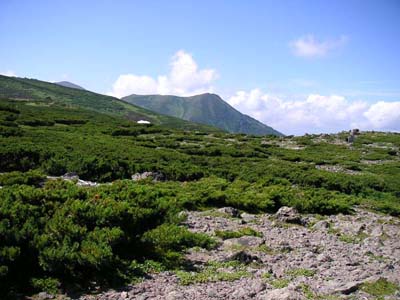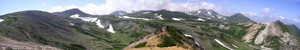 「正面に見えるのは白雲岳、左手遠くにトムラウシが見えます。まもなくお鉢で休憩です。」