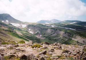 (写真左下:赤岳より表大雪。左は白雲岳、正面は北鎮岳)昼食後、別れを惜しんで下山。駒草平のコマクサ達よ、第二花園の花々よ。 又来る時も笑顔で迎えてくれ。心で、祈りながら大雪を去った。 |