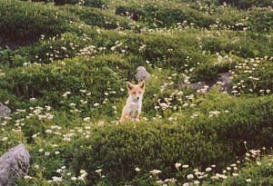 もう、十年も前のことだ。そんな思い出の山に久し振りにおとずれた。天気は良い。期待に胸躍らせて銀泉台登山口を出発。しばらくは林の中の 斜面をトラバースするように登る。木の根や、段差がありよい道ではない。 まもなく、第一花園に着く。斜面のお花畑だが、何時きてもたいしてきれいではない。 前に来たとき、二頭の蝦夷しかが斜面の上部にいてびっくりした。紅葉の時期の このあたりは感動的だと二人の人から聞いた。ハイマツ帯をくぐりぬけると 第二花園が開ける。雪渓が残り、チングルマとコサクラのお花畑だ。 キタキツネの子供がひょっこり姿を現し、出迎えてくれた。怖がる様子はない。 (写真右上:第二花園のチングルマの中で出迎えてくれたキタキツネ) 何時きてもここは心なごむ。ここから先は神々の遊び場だ。少しの登りで 駒草平に着く。敷き詰められた大小の岩のあいだに点在するコマクサ、何時きても 感動してしまう。やっぱりここのコマクサが一番だ。あたりは、展望が開け、 大雪の大きさがを思う。ほぼ平坦な道だ。やがていよいよ赤岳の登りになる。