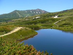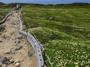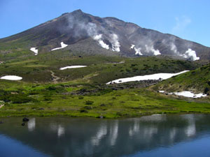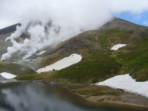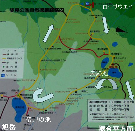 | 旭岳温泉ロープウエイ駅(9:30)ー(ロープウエイ)−(9:40)姿見駅(9:45)−夫婦池(9:50)ーお花畑(10:05) ー(10:30)裾合平途中(10:45)ー夫婦池(11:15)ー(11:35)姿見の池(11:40)−(12:00)姿見駅 登り1:00 下り1:15 |