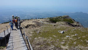 登り始めて、最初のうちは見通しは悪い。それでも次第に木の間から山頂の稜線が見えてくる。 ![]() ( しだいに山頂の稜線が見えてくる ) 6合目の避難小屋に着く。大勢の人が休んでいる。登山者は多い。小さな子供もいる。6合目を過ぎると見通しが良くなる。海が見えてくる・・米子の海…日本海だ。 ![]() ( 6合目の避難小屋のにぎわい) (遠くに米子の海・・・日本海 ) 8合目を過ぎるとハイマツ帯に作られた木道がつづく。雄大な眺めだ。歩きやすいはずだが、足は重い。疲れてきているのだろう。 ( ハイマツ帯に木道が伸びる・・・山頂は近い ) 山頂に到着。随分混んでいる。昼食を食べゆっくり休む。雄大な光景を見ながら下山する。 ![]() ( 山頂での記念写真を撮って下山する ) 下山中、登山口から少し登ったところにある阿弥陀堂に立ち寄る。なかなか静かなたたずまいで心が和む。 ![]() ( 静かなたたずまいの大山寺阿弥陀堂) ) 高速米子道から見る大山は実に堂々として風格がある。山の姿に見とれながら帰路につく。 ![]() ( 高速道路 米子道から見る大山) |