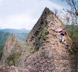 まもなく岩峰の下の岩壁にでる。注意深くこの地点をトラバースし、
