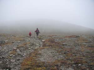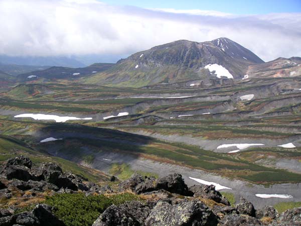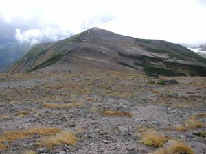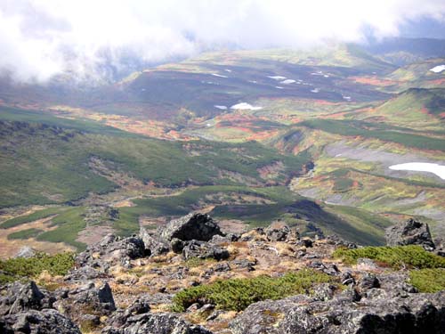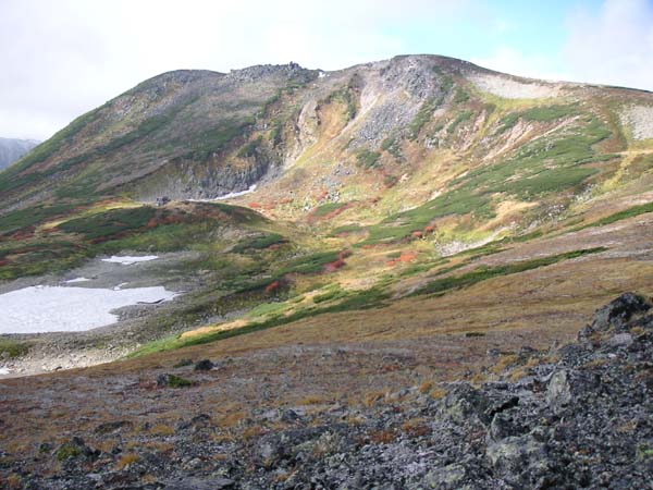 紅葉を目指し大雪山へ。この時期、銀泉台と高原温泉にはシャトルバスが運行され、 自家用車は規制されている。かえって、シャトルバスを利用すると、自家用車をシャトルバスの駐車場において、 銀泉台ー高原温泉の縦走が出来る。平成14年にも登ったが再挑戦する。今年は紅葉がきれいだという。 札幌を早朝3:00発 6:00に駐車場に着く。もうかなり込み合っている。何と初発バスに乗り込み、銀泉台に入る。 第一花園の紅葉が見える。かなり赤い。はやる心で登山開始。間もなく斜面全体の紅葉に感動。 ウラジロナナカマドの紅葉だ。 ( 第一花園の紅葉 ) 第一花園からハイマツ帯を過ぎ、第二花園に着く。雪渓は解けていたが、今年は遅くまで残っていたのだろう。 今ごろ、アオノツガザクラが咲いている。 ![]() ![]() ( 第二花園と今頃咲いていたアオノツガザクラ ) 奥の院、駒草平を過ぎると、第三雪渓の紅葉が見えてくる。 ![]() ( 奥の院の紅葉 ) ( コマクサ平 ) 第三雪渓の雪渓はない。ハイマツ緑とナナカマド紅葉のコントラストがまぶしい。 ![]() ( 第三雪渓の紅葉 ) ![]() ( 第三雪渓を登る登山者 ) 風が強くなってくる。寒い。ヤッケを着る。いつも赤岳山頂間近は強い風だ。 山頂の岩に着く。ヤッケを着ていても寒い。 ![]() ( 赤岳山頂の岩 北鎮には雲がかかっている 記念写真 寒かった! ) ( 赤岳から見る旭岳 ) 寒いので、小休止で小泉岳を越え白雲岳を目指す。振り返ると平坦な小泉岳が見える 白雲岳 赤岳 小泉岳 ![]() ( 白雲岳を目指す 旭岳に雲 ) ( 振り返ると小泉岳、左下に赤岳 ) 分岐から白雲山頂を目指す。山頂は一番奥の岩の上だ。雲が出てきた。 最後、岩を登ると山頂だ。ガスの中、高根が原、忠別川の源流の紅葉が見える。 旭岳、トムラウシ方面はガスで何も見えない。 ![]() ( 高根が原、忠別川の源流の紅葉 ) そのうち晴れるさ!じっと待つ。ガスが切れてゆく。旭岳が姿を現す。思わず歓声を上げる。 ![]() ( 白雲岳から見る旭岳 ) 寒いが、雄大な旭岳に見とれる。白雲岳は大雪山の中心に位置する。 今日は、十勝連峰もトムラウシ山も見えない。昼食を食べて小泉岳まで戻り、緑岳へ向かう。 火山灰の平らな道の行く手がガスで視界が消えたり、見えたりする。 ![]() ( ガスが立ちこめる) ( 再び緑岳の山頂が見える ) 右手に白雲岳が大きく聳える。 ![]() ( 白雲岳 ) 緑岳に着く。強風。寒い。早々に下山する。雄大な紅葉の美しさに呆然と立ちすくむ。ハイマツとナナカマドの美しさ。 ![]() ![]() ( 緑岳から下山、雄大な紅葉に感激 ) お花畑には、チングルマの紅葉 、ミヤマリンドウの小さな花、少しだがチングルマの花や ツガザクラの花も咲いていた。山の花達に別れを告げる。緑岳を振り返りつつ、去りがたい気持ちで高原温泉へ下った。 ![]() ( 第一お花畑から緑岳 ) ![]() ( チングルマの紅葉 ミヤマリンドウ ) |