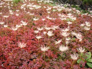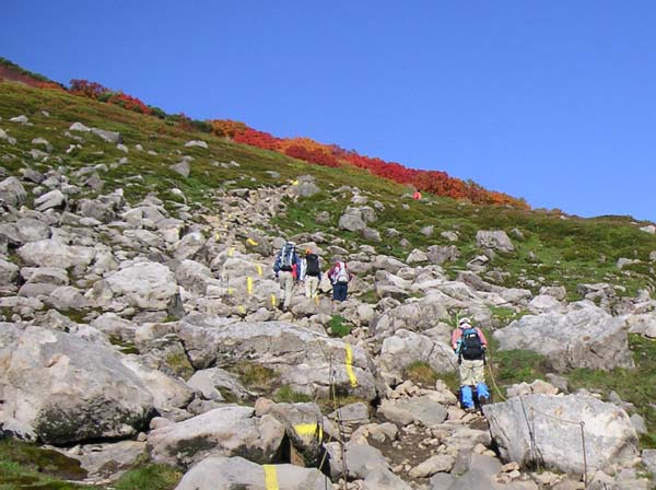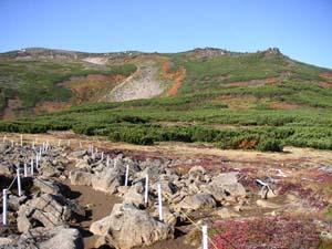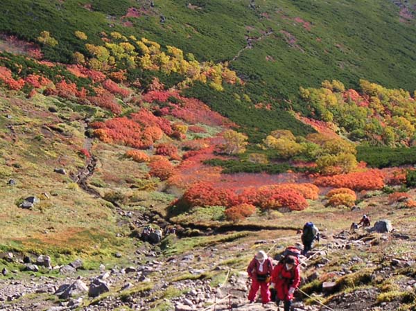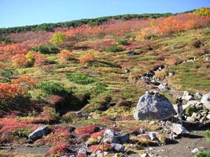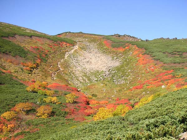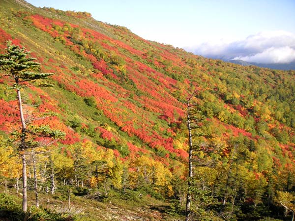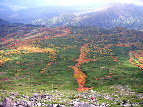 に生えるという。たしかに沢筋には縞模様をつくり、お花畑では周りを取り囲こんで赤く紅葉している。