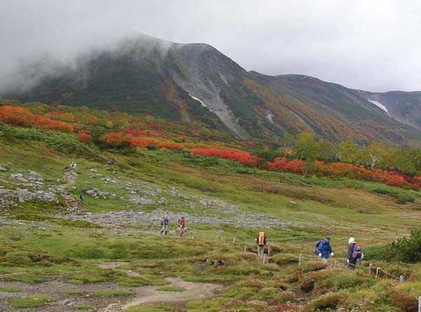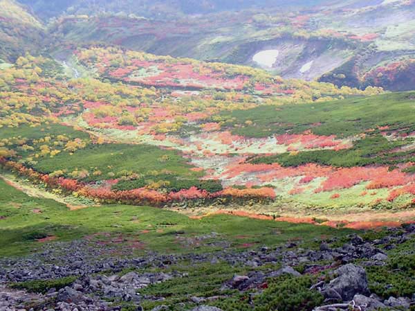 ハイマツの緑とのコントラストが鮮やかだ。 赤岳も高原温泉も大雪山の紅葉の名所である。特に、赤岳の美しさは何度も登山者から聞いた。 以前に登ったときは、それほど印象にのこらなかったが、今回は本当に美しい。 また、高原温泉は沼めぐりの紅葉が有名であるが、緑岳から見る雄大な紅葉に感動。白雲岳の展望は 今回はガスと数日前に降った初雪で色がくすんでしまったが、忠別川の源流の紅葉もきっと素晴らしいはず。 紅葉の美しさに感動した一日であった。また何時か、シャトルバスを利用して縦走しよう。 |