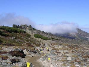 銀泉台(6:50)ー(9:10)赤岳(9:20)ー(10:20)白雲岳(10:45)ー(12:00)緑岳(12:15)ー(14:35)高原温泉 登り 3:30 下り 3:50 全行程 7:45 |