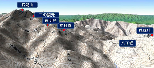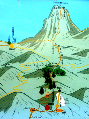 ロープウエイから石鎚山のコースは、山頂駅から約20分で石鎚神社成就社、そこから八丁坂を標高差にして100m下る。最下部のコルからはいよいよ上り。標高差700mを上ると山頂となる。 ![]() ![]() ( 石鎚山概念図 ) |