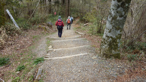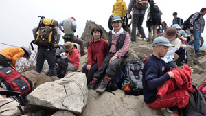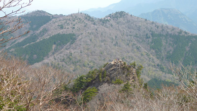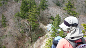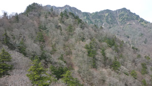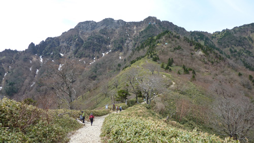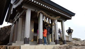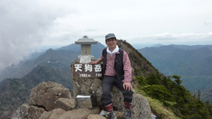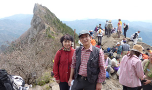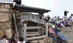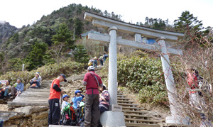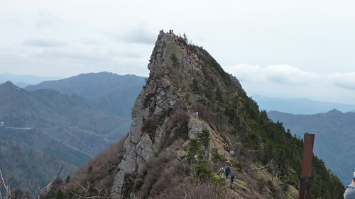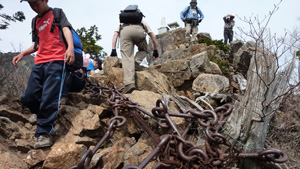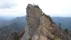 山頂駅から約20分で石鎚神社成就社に着く。山行の無事を祈る。山門を過ぎると早速、八丁坂の下り 。 ![]() ( 石鎚神社成就社) (八丁坂の下り ) いよいよ登りが始まる。まもなく登山者が並んで鎖を上っている。よく考えず、私達も挑戦。かなりの絶壁。崖の苦手な洋子は、回りの人に助けられなんとか上る。石鎚山の山頂が望まれるが、下を見ると恐ろしい。真下に前社森の小屋。 ![]() ( 試しの鎖) (鎖場の頂 ) ![]() ( 試しの鎖の頂きからみる山頂) (鎖場の頂から前社森の小屋を見下ろす ) 親切な登山者に励まされ、何とか試しの鎖を降りる。もう鎖は登らないこととする。気を取り戻して再出発。振り返ると今上った岩峰が見える。 ( 試しの鎖の岩峰と奥に出発した石鎚神社成就社) 夜明峠。雄大な石鎚山の全景が姿を現す。まだ、山頂は遠い。 ( 夜明峠・・・石鎚山の全景が姿を現す) この山は階段が多く、足が疲れる。一の鎖元は登らず回り、山頂直下の二の鎖元に到着。土小屋から来る人が多く、ずいぶん混み合っている。天狗岳の岩壁をみると数人の人が岩登りをしている。 ![]() ( 二の鎖元・・・土小屋の分岐) (北壁・・・岩壁を上っている人がいる ) 鎖は登らず、山頂(弥山)に到着。信仰の山だ。立派な神社がある。山頂はずいぶん人が多い。 ![]() ( 石鎚神社山上社) さらに奥に鋭い天狗岳が聳える。 ( 天狗岳の雄姿 ) 洋子を残し、天狗岳を目指す。岩の上を歩くところもあり、雨でぬれているときは滑りやすく危険だ。山頂で写真を撮ってもらい、Uターンする。 ![]() ( 天狗岳の頂き) ![]() ( 山頂での記念写真 ) 山頂(弥山)はこれが山の山頂かなと思うほど賑やか。岩に座り昼食をとってからスミレを見ながらゆっくり下山する。 ![]() ( スミレの花がたくさん咲いていた ) |
