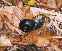 落ち葉の道をゆく。道端に珍しい真っ黒なブドウマイマイを見つける。