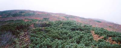 振り返ると、ガスの切れ目から、反対側にやや色のさめた紅葉の山の斜面