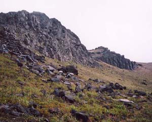 崩れ落ちた岩が至るところに転がっている。岩壁の基部の斜面を回り込み、