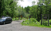 花に飾られたペンションを出発。国道から高原温泉へ向かい、出発してから20分で高原温泉との林道の分岐点ヤンベ分岐につく。 ここにはゲートがあり、鍵がかかっている。 前もって上川森林管理事務所(Tel:01658-2-1171)で聞いていた 鍵の番号でゲートを開け林道に入る。