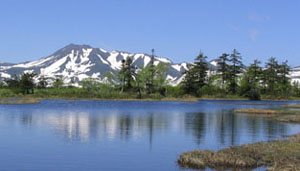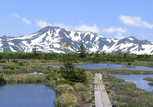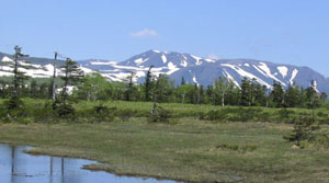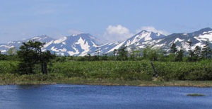 ![]() トムラウシ山の右手には高根ヶ原が白雲岳までつづく (写真左:中心は白雲岳。左は高根が原。右のなだらかな山頂は小泉岳、 その右端の突起が赤岳) ![]() トムラウシ山の左手には十勝連峰が残雪に輝いている。 (写真左:左奥から十勝岳、美瑛岳、オプタテシケ山) 至福の時だ。かって若かりしとき、一緒にトムラウシ山を目指し、旭岳から白雲を越え、高根ヶ原を歩いたとき のことが走馬灯のように思い出す。30数年後の今、同じ友とここでその道を共に振り返ることが出来るとは なんという幸福なことか。 沼の原分岐に着く。あいかわらずトムラウシ山から化雲(かうん)岳、五色岳、高根が原の 途方もなく長い稜線が見える。大沼方面から年配の4人パーティが戻ってくる。「すばらしいですね。」 そんな会話がぴったりだ。 少し休憩して大沼方面へ向かう。大小の沼の中を縫うように 木道がどこまでもつづく。正面にはトムラウシ山。これがカムイミンタラ、神々の遊ぶ山々(にわ)。 そんな気持ちにさせる。