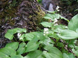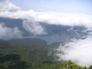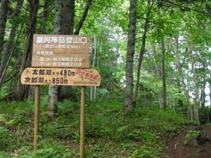 天候は曇り。ときに小雨がまじる。回復もあまり期待出来ない。しかしせっかく来た阿寒、 登らなくては。登山口は阿寒湖から流れ出る阿寒川の河口のところだ。原生林の林がつづく。 太郎湖、次郎湖は静まりかえっている。 ![]() (概念図) (登山口の標識) 登山道は暗い。ゴゼンタチバナ、マイズルソウがひっそりと咲く。ゴゼンタチバナの花は6枚葉 に咲き4枚葉の株には花はないという。確かにそうだ。マイズルソウは葉が鶴が舞っているよう ように見えることからついた名というが・・・。 ![]() (左:ゴゼンタチバナ 6枚葉に花、4枚葉に花なし 右:マイズルソウ) 4合目に着く。これから5合目までが正念場。ゆっくり登る。5合目に着く。8割登ったとの 標識?・・・変な標識。 ![]() (4合目で半分以上) (5合目で8割?) あたりはハイマツ帯。ガスが切れて青い空が顔を出してきた。 信じられないが晴れてくるようだ。5合目からは高山のムード。 足取りも軽くなる。8合目からは山頂がみえる。下界は雲海の下で見えない。 まわりのイソツツジ、イワウメがきれいだ。 ![]() (5合目で晴れてきた) (5合目からは高山のムード) ![]() (イソツツジ) (イワウメ) いよいよ、最後の登り。高齢男性の二人パーティが下山してくる。「パンケトーが見えましたよ。」 と言ってくれる。あと一歩。元気が出る。 ![]() (雄阿寒岳山頂を望む) 山頂に着く。誰もいない山頂。思わず万歳! 雲海の切れ目からパンケトーが見え隠れする。 ペンケトーは雲の中。ガスのなか登ってよかった。 ゆっくり休んで下山する。 ![]() (秘湖、パンケトー) (山頂で万歳) | ||