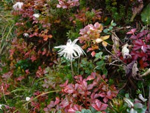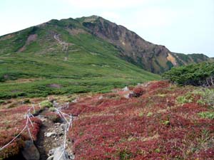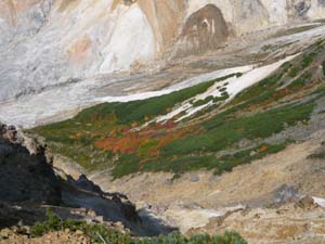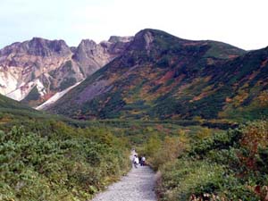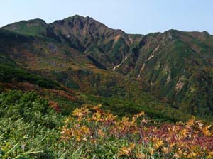紅葉の季節。例年、大雪山を登っているが十勝連峰の紅葉はどうか?と思い、三峰山の縦走コースを計画する。いつもの凌雲閣 前の駐車場に車を止める。大雪山からみるとずいぶん車の数は少ない。 歩き始める。正面に安政火口とカミホロカメットク山の荒々しい岩肌が見える。左手には三段山。斜面にわずかな紅葉が見える。 ![]() ( 安政火口とカミホロカメットク山 ) ( ナナカマドと三段山 ) 富良野岳に向かって進む。やがて正面に富良野岳が、振り返ると十勝岳が聳えている。ナナカマドの紅葉は赤より橙色のが多い。 ![]() ( 正面に富良野岳 ) ( 十勝岳 ) 富良野岳と三峰山の分岐に着く。下山路のD尾根の緑の上に十勝岳が優雅に聳える。 ![]() ( 遠く十勝岳を望む) 今回は富良野岳を登らず、分岐から三峰山を目指す。まもなくチングルマの紅葉帯。夏はお花がきれいなところだ。振り返ると富良野岳。ところどころにウラシマツツジの赤い紅葉がまぶしい。 ![]() ( 三峰山を目指す) ( 振り返ると富良野岳 ) ![]() ( チングルマの紅葉) ( ウラシマツツジ ) 三峰山の富良野岳よりのひとつの峰を登ると本峰の岩肌が見える。思ったより簡単に本峰の山頂に着く。ここの山頂は狭いが、絶壁になっていて、見晴らしがいい。標識がある。 ![]() ( 岩の本峰を見る) ( 三峰山の山頂 ) 少し休んでから上富良野岳へ向かう。十勝岳を遠く望む。雄大な景色に見とれる。 ( 十勝岳遠望 ) 上富良野岳は近い。振り返ると三峰山と富良野岳。上富良野岳から十勝岳を望む。 ![]() ( 振り返ると三峰山と富良野岳) ( カミホロカメットク山と十勝岳を望む ) ![]() ( 安政火口の紅葉) ( 八ッ手岩 ) |