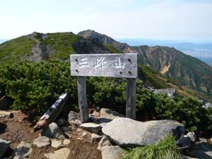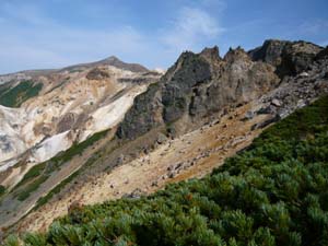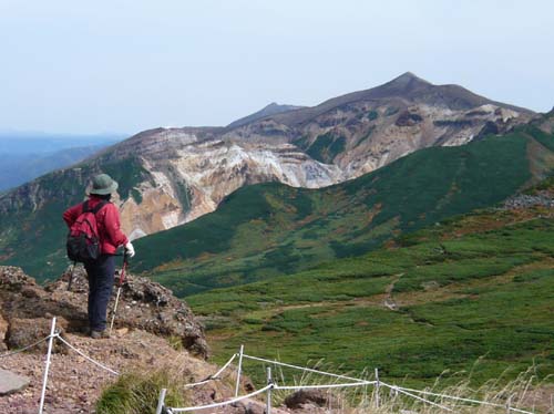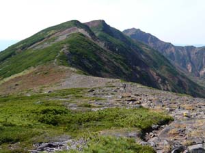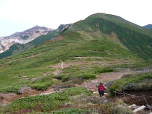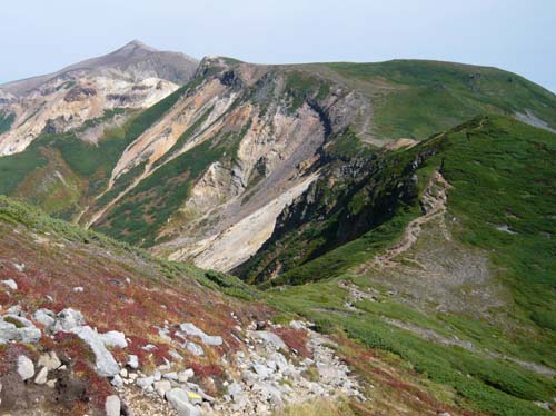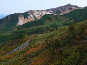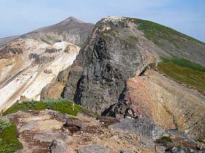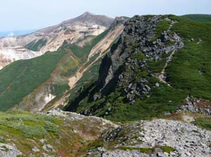 十勝岳温泉登山口ー富良野岳稜線分岐ー三峰山 ( 富良野岳分岐より見上げる三峰山と遠く十勝岳 ) |