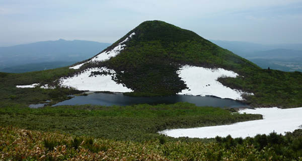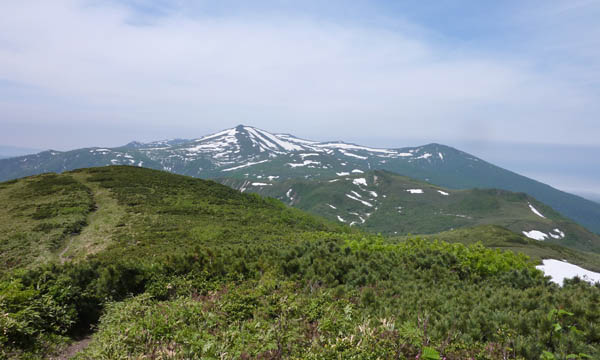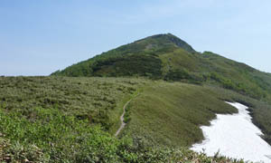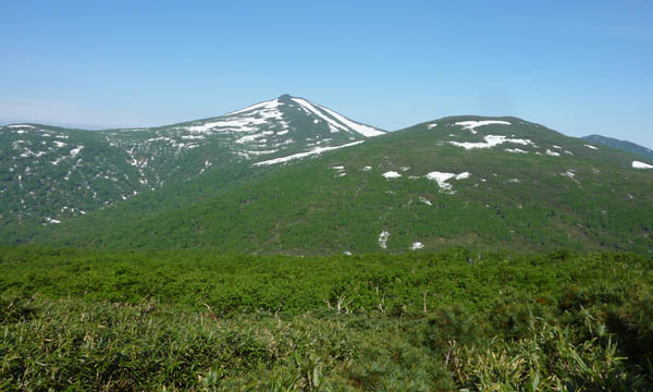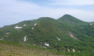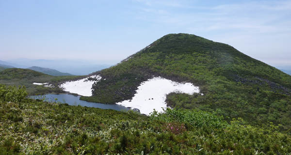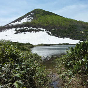 天気は快晴。羊蹄山のふもとを通り。ニセコへ向かう。今の時期は白樺山のお花畑がきれいなはず。出来ればシャクナゲ岳を目指そう。 ( 今日は羊蹄山が美しい ) 新見峠から少し新見温泉に下った所に駐車場があり、 山菜採りの車がたくさん駐車している。そこから目国内岳と白樺山の登山口が向かい合っている。登り始めて、まもなく雪が残っている。今年は雪解けが遅い。 ![]() (登山口から少し登るとまだ雪が残っている ) 根曲がり竹の道が続く。まもなく見晴らしが良くなる。目国内岳の雪渓が輝いている。 ![]() ( 目国内岳が堂々と聳え、雪渓がまぶしい ) 稜線に出る。正面にシャクナゲ岳、白樺山のピークは近い。 ( 左に白樺山ーーー正面にシャクナゲ岳 ) 白樺山の山頂直下はお花畑。ミヤマアズマキク、ミヤマオダマキ、チシマフウロ、ハアクサンチドリ。今年もいろいろな花が美しい。シロバナハクサンチドリも一本咲いていた。 ( お花畑とシャクナゲ岳 ) ( ハクサンチドリと1本だけあった白花ハクサンチドリ ) 下山中、登山口から少し登ったところにある阿弥陀堂に立ち寄る。なかなか静かなたたずまいで心が和む。 (ミヤマオダマキ と ミヤマアズマギク ) 白樺山の山頂に着く。目国内岳、これから向かうシャクナゲ岳が堂々と聳えている。 (白樺山の山頂・・・目国内岳が見える ) ![]() ( 目指すシャクナゲ岳は遠い) 白樺山からは下り。根曲がり竹の道が続く。シラネアオイがたくさん咲いている。途中竹の子も見つける。タカネザクラも満開。エゾヤシオツツジのピンクの花は可憐。 ( シラネアオイがたくさん咲いている ツバメオモトもかわいい ) ( タカネザクラとエゾヤシオツツジ ) ハイマツ帯となり、再び視界が開け、シャクナゲ岳が姿を現した。ふもとにシャクナゲ沼が見える。夫婦の登山者が戻ってくる。聞くと「沼の水が溢て渡れない。若い男のひとは藪こぎで山頂をめざした。」と教えてくれる。心配していたが、今年もダメなようだ。行ける所まで行こう。 ![]() ( シャクナゲ岳とシャクナゲ沼) 沼への下りは岩がごろごろして歩きずらい。沼に着くと、道は水の下。山頂へ行くには、左側の竹藪に入らねばならない。 ![]() ( 沼への下りは岩の道。やがて登山道は水の下となる) あきらめて引き返す。眼下に歩いてきた尾根道が続く。奥に目国内岳、岩内岳。雄大な景色を眺めながら、ゆっくり下った。 ![]() ( 右眼下に歩いてきた尾根道と白樺山。奥に目国内岳、岩内岳) |