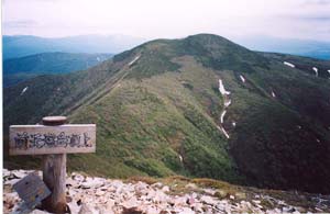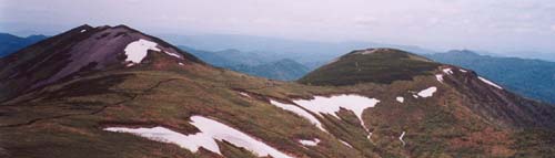 (写真下:天塩岳から登山道を振り返る。右手に丸山が見える。)