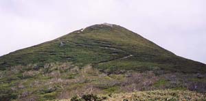 平らな丸山から山頂を眺める。広々とした、なだらかな曲面