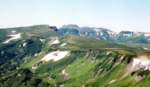 (写真右:大雪・緑岳からみるトムラウシ山(中央))