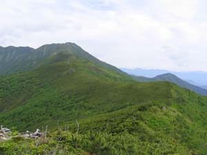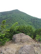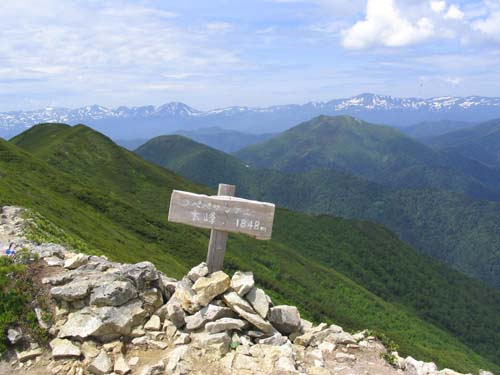 なおも登りがつづく。かなりササに覆われて、歩きづらい。いいかげん疲れた頃、 やっと1399m峰に着く。少し展望が開けほっとする。右手に1610m峰ピークが見える。 (写真右:1399m峰から見る1610m峰方面。) 登ってきた道に左手にも踏み跡があるが、迷い道。ちょっとわかりずらいが、 写真の石の右手ところに標識があり、そこが1610m峰への登山道である。 1610m峰へ向かう。ササや木に覆われ歩きづらい。ところどころに咲くゴゼンタチバナとエリモシャクナゲ が疲れた体をなぐさめてくれる。 ![]() やっと1610m峰のピークに着く。ついに大展望が開け、遥かつづく尾根道の彼方にウペペサンケの全容が 姿を現す。二ペソツは山の後ろで見えない。 (写真左:つづく尾根道と糠平富士の山頂。糠平富士にはまだ遠い。 糠平富士の左手には稜線の凹凸。そこにウペペサンケ山の最高点がある。) ハイマツの尾根を進む。イソツツジ、コケモモの花がいたるところに咲いている。 以前に登ってきた菅野温泉コースの分岐に着く。この辺はハイマツの背が高い。わずかな登り で最終ピークに出る。 ウペペサンケ山への最後の登りが眼前に広がる。最も高く見えるのが糠平富士。 糠平富士にはもうひと頑張り。低く見えるが、糠平富士の左手のいったん下って、 奥の稜線の凹凸の右から4番目がウペペサンケ山の最高点。
