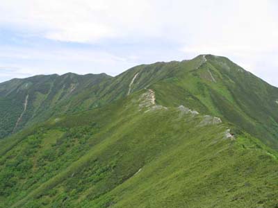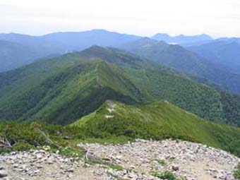 花を見ながらゆっくり登る。やっと糠平富士の山頂に着く。ウペペサンケ山の標識もあるが、 ここは最高点ではない。眼前に二ペソツが表大雪、高根が原をバックに姿を現す。 ![]() 二ペソツ山 前天狗から山頂へのつり尾根がよくわかる。 この登りがけっこうつらかった。 糠平富士から歩いてきた尾根道を振り返る。尾根の先端から、はるばる来たなと感激する。 ![]() 糠平富士から振り返る登山道。 ゆっくりしてはいられない。ウペペサンケ山の最高点(本峰)を目指して出発。まもなく かなり下る。この切れ込みの最低部には雪渓がのこり、キバナシャクナゲ、ハクサンイチゲが咲いていた。 再び登り、見晴らしの良い狭い尾根を少し行くやっとウペペサンケ山(本峰)の標識があり 最高点に着いた。さらに西峰へ道はつづいていたが疲れていたのでここで終わりとする。 遥か、十勝連峰とトムラウシを眺める。考えていたより遠い。十勝連峰とトムラウシの間は ずいぶん長いなー。ここの縦走は岳人のあこがれのコースだ。僕にとってはもう夢のまた夢。
