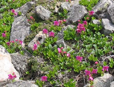 糠平富士への最後の登り ここからの登りはつらかったけど、尾根の斜面にいろいろな花がきれいに咲いている。コマクサもところどころ群生し、 なんといってもエゾツツジがすばらしかった。北海道の高山植物の中でももっとも艶やかな この花。何度も見ているが、今迄で最高のすばらしさであった。 (写真下:エゾツツジの群落)