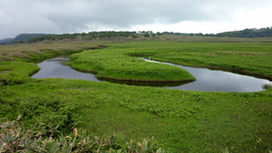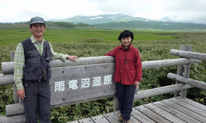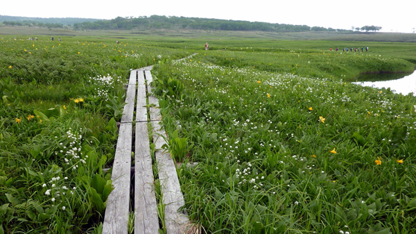 天気はくもり。雲が多い。この時期花が美しい雨竜沼湿原に向かう。登山口の南暑寒荘には大きな駐車場がありキャンプ場も完備されている。到着時にはすでにたくさんの車が駐車している。湿原保存の入園料 一人500円を支払い登山開始。20分ほどで滝に着く。上から覗き込む。 ![]() ( 南暑寒荘) (白竜の滝) 第二吊橋が湿原までのちょうど中間点になる。ここからは少し急斜面を登る。沢の淵に着いたら間もなく湿原入口に着く。正面に南暑寒別岳、その右側にガスで半分が隠れた暑寒別岳が聳えている。前回来たときは見えなかった。 ![]() ( 第二吊橋 湿原入口までの中間点) (湿原入口から見る暑寒の山 ) 入口の休憩場所の先は木道が続く。休む場所はない。湿原の中にはワタスゲが美しい。 ![]() ( 湿原の中、木道がつづく ) ![]() ( ワタスゲが美しい) 雨竜沼湿原には700もの池塘があるという。池塘に南暑寒別岳が姿が映す。 ![]() ( 池塘と池塘に姿を映す南暑寒別岳 ) エゾカンゾウが所々で咲いているが、まだ少ない。最盛期は1−2週間後だろう。花を見ながら、木道を一周して入口の休憩所に戻る。天気が良ければ暑寒の山がすばらしいだろう。初記念写真を撮って下山する。 ![]() ( エゾカンゾウの花はまだ少ない) ( 休憩所で記念撮影 ) |