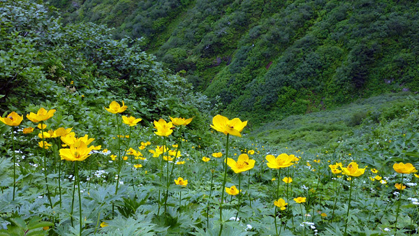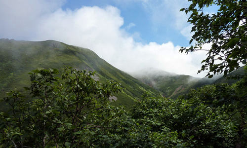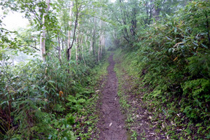 久しぶりで ニセイカウシュッペ山を目指す。天気はまずまずか。比布インターチェンジから現在建設中の無料の高速道路の終点(将来 上川天幕・出口?)で降りる。そのまま紋別方向に向かう。中越橋の手前から右手に入り、高速の下をくぐり林道に入る。まもなく標識があり右手に曲がるとゲートに出る。前もって 上川中部森林管理所(01658-2-2001)に電話し聞いておいた鍵の番号で開く。林道は思ったより整備されている。 登山口に到着。駐車場には3台の車がすでに駐車されていた。登山開始、道は広くて歩きやすい。雨は降っていないが、まわりはガスで見通しは悪い。 ![]() ( 登山口) (登山道) 展望台に着くが、表大雪はガスの中。見晴台についても展望は開けない。 ![]() ( 展望台) (見晴台 ) このコースは尾根道であるが、木が多くあまり見通しは良くない。 少し青空が見えてくる。ガスの切れ目から山頂が!! ![]() ( ガスがきれ、山頂が見えてくる ) 斜面は花畑、いろいろな花が咲いている。 ![]() ( チシマノキンバイソウ) ![]() ( ミヤマリンドウ) (ウメバチソウ) ![]() ( トモエシオガマ) 山頂に到着する。ガスで視界は良くないが、しだいに登ってきた山並が見えてくる。 ![]() ( 姿を現した大槍) ( 山頂での記念撮影 ) ついにガスが切れ、全容が現れた。大槍がどっしりと聳える。山腹に登ってきた登山道が見える。この景色をみるために登ってきたのだ。 ![]() ( 姿を現した大槍と登ってきた登山道) 山頂は風が強い。早々に下山する。平山方面への尾根の恐竜の背のような通称アンギュラスが鋭い。穂高のジャンダルムより見事。 ![]() ( 平山方面の途中に聳えるアンギュラス ) ( 下山路から見る大槍 ) 時々、山頂を振り返りながらどんどん下る。見晴台からは登るときに見えなかった小槍が見えた。展望台から望む表大雪の山頂は雲に隠れていた。 ![]() ( 見晴台からみる小槍・・・右の突起 ) ( 展望台からの表大雪・・・雲に隠れている ) |