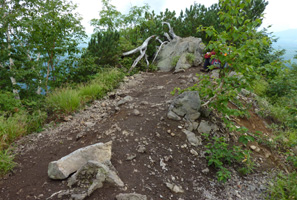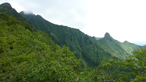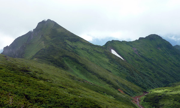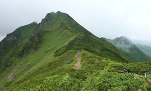 感想 : この山の登山道は尾根の上であるが、必ずしも展望は良くない。この山の最大の魅力は何といっても山頂から、登ってきた雄大な大槍と尾根の全容を見ることであろう。今回、ガスの中の登りであったが、下山時にガスがきれて、幸せだった。なお、平山からニセイカウシュッペを見ると、大槍と小槍の尾根は実に迫力があり、感動する。 |
